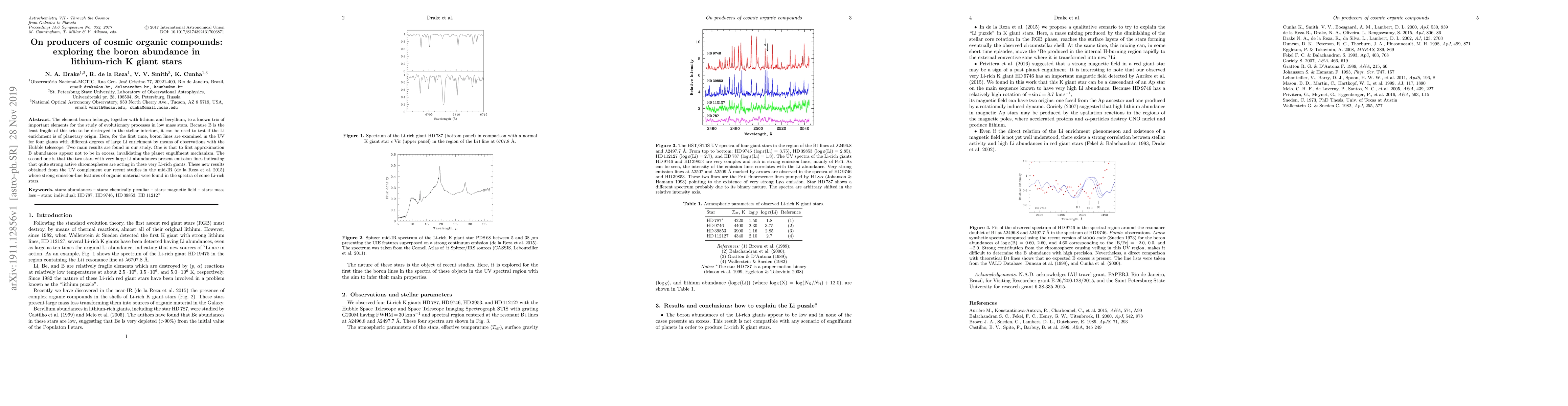 The element boron belongs, together with lithium and beryllium, to a known trio of important elements for the study of evolutionary processes in low mass stars. Because B is the least fragile of this trio to be destroyed in the stellar interiors, it can be used to test if the Li enrichment is of planetary origin. Here, for the first time, boron lines are examined in the UV for four giants with different degrees of large Li enrichment by means of observations with the Hubble telescope. Two main results are found in our study. One is that to first approximation B abundances appear not to be in excess, invalidating the planet engulfment mechanism. The second one is that the two stars with very large Li abundances present emission lines indicating that quite strong active chromospheres are acting in these very Li-rich giants. These new results obtained from the UV complement our recent studies in the mid-IR (de la Reza et al. 2015) where strong emission-line features of organic material were found in the spectra of some Li-rich stars.