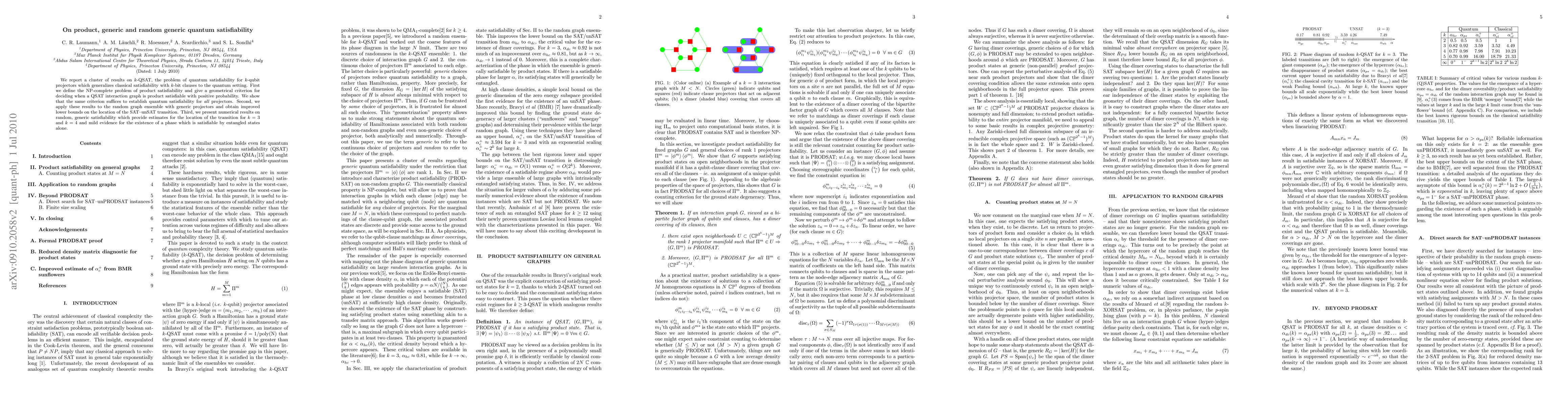 We report a cluster of results on k-QSAT, the problem of quantum satisfiability for k-qubit projectors which generalizes classical satisfiability with k-bit clauses to the quantum setting. First we define the NP-complete problem of product satisfiability and give a geometrical criterion for deciding when a QSAT interaction graph is product satisfiable with positive probability. We show that the same criterion suffices to establish quantum satisfiability for all projectors. Second, we apply these results to the random graph ensemble with generic projectors and obtain improved lower bounds on the location of the SAT--unSAT transition. Third, we present numerical results on random, generic satisfiability which provide estimates for the location of the transition for k=3 and k=4 and mild evidence for the existence of a phase which is satisfiable by entangled states alone.