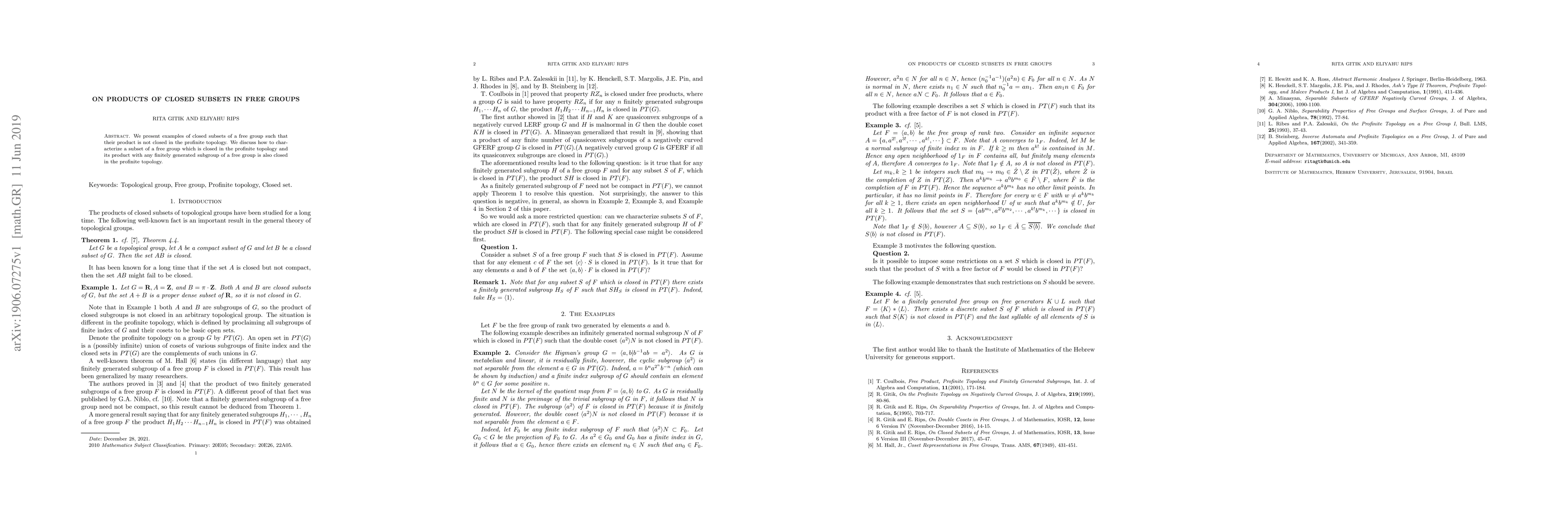 Research shows examples of closed subsets in free groups whose product is not closed, while others have conditions for their product to be closed under the profinite topology.