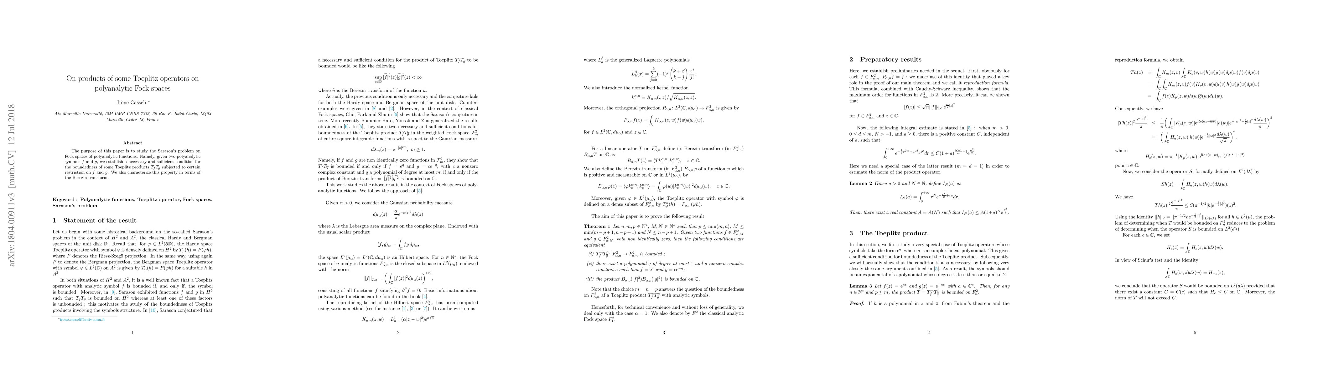 The purpose of this paper is to study the Sarason's problem on Fock spaces of polyanalytic functions. Namely, given two polyanalytic symbols $f$ and $g$, we establish a necessary and sufficient condition for the boundedness of some Toeplitz products $ T_{f}T_{\bar g}$ subjected to certain restriction on $f$ and $g$. We also characterize this property in terms of the Berezin transform.