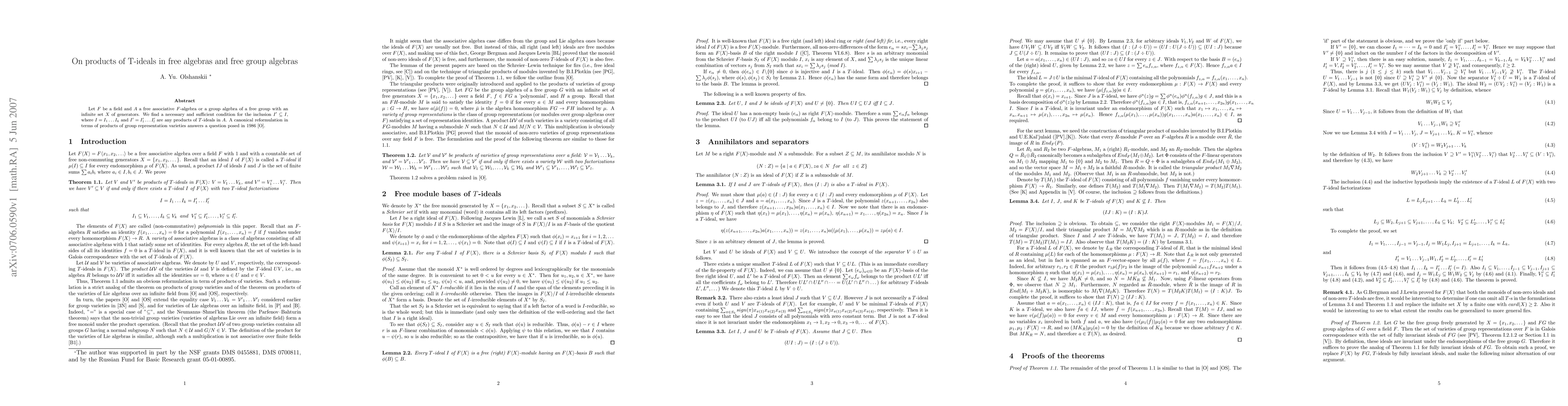 Let F be a field and A a free associative F-algebra or a group algebra of a free group with an infinite set X of generators. We find a necessary and sufficient condition for the inclusion I' into I, where I=I_1...I_k and I'=I'_1...I'_l are any products of T-ideals in A. A canonical reformulation in terms of products of group representation varieties answers a question posed in 1986