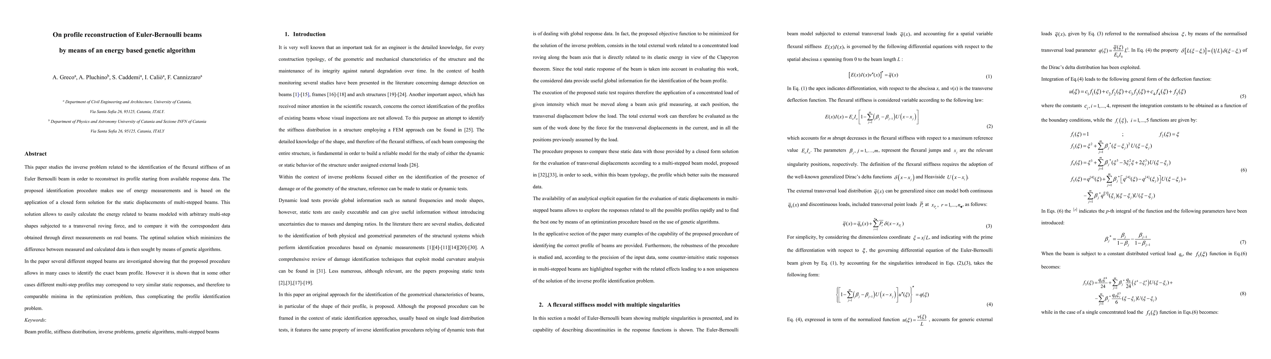This paper studies the inverse problem related to the identification of the flexural stiffness of an Euler Bernoulli beam in order to reconstruct its profile starting from available response data. The proposed identification procedure makes use of energy measurements and is based on the application of a closed form solution for the static displacements of multi-stepped beams. This solution allows to easily calculate the energy related to beams modeled with arbitrary multi-step shapes subjected to a transversal roving force, and to compare it with the correspondent data obtained through direct measurements on real beams. The optimal solution which minimizes the difference between measured and calculated data is then sought by means of genetic algorithms. In the paper several different stepped beams are investigated showing that the proposed procedure allows in many cases to identify the exact beam profile. However it is shown that in some other cases different multi-step profiles may correspond to very similar static responses, and therefore to comparable minima in the optimization problem, thus complicating the profile identification problem.