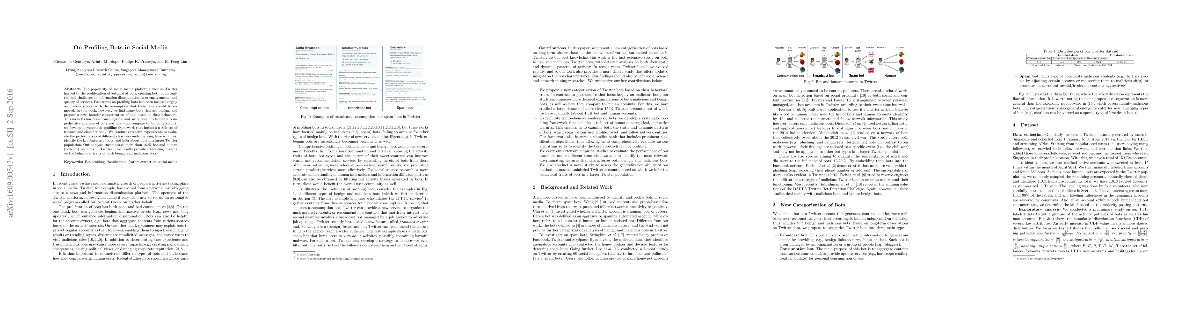A machine learning approach using a linear regression classifier was employed to classify Twitter accounts into human, broadcast bot, consumption bot, or spam.