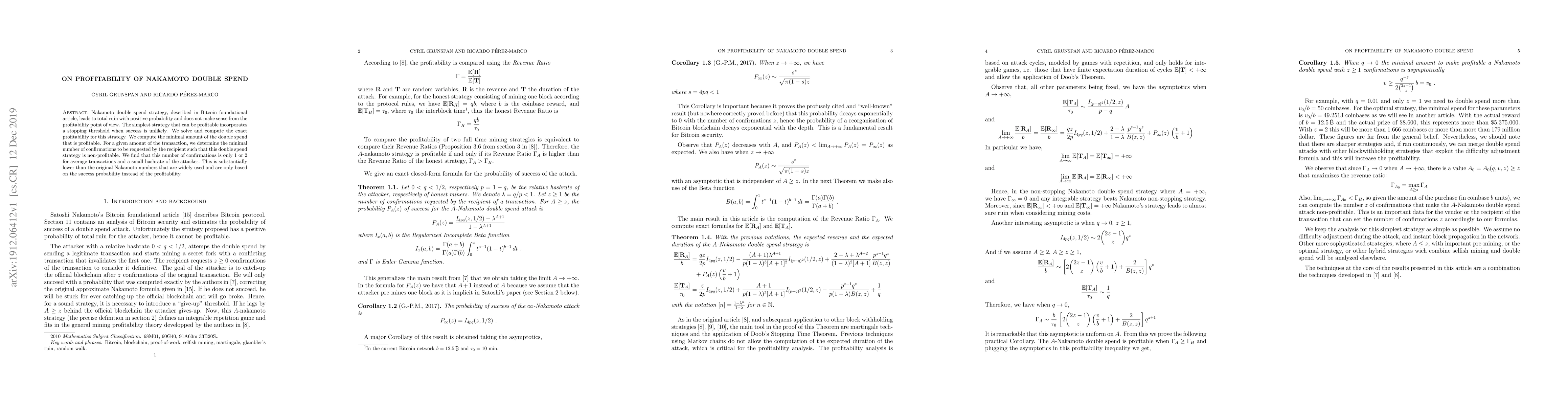 This paper analyzes the profitability of the Nakamoto double spend strategy in Bitcoin, showing it leads to ruin with positive probability. It proposes a more profitable strategy with a stopping threshold and computes the exact profitability, finding that only 1 or 2 confirmations are needed to render the strategy non-profitable, much lower than previously suggested.