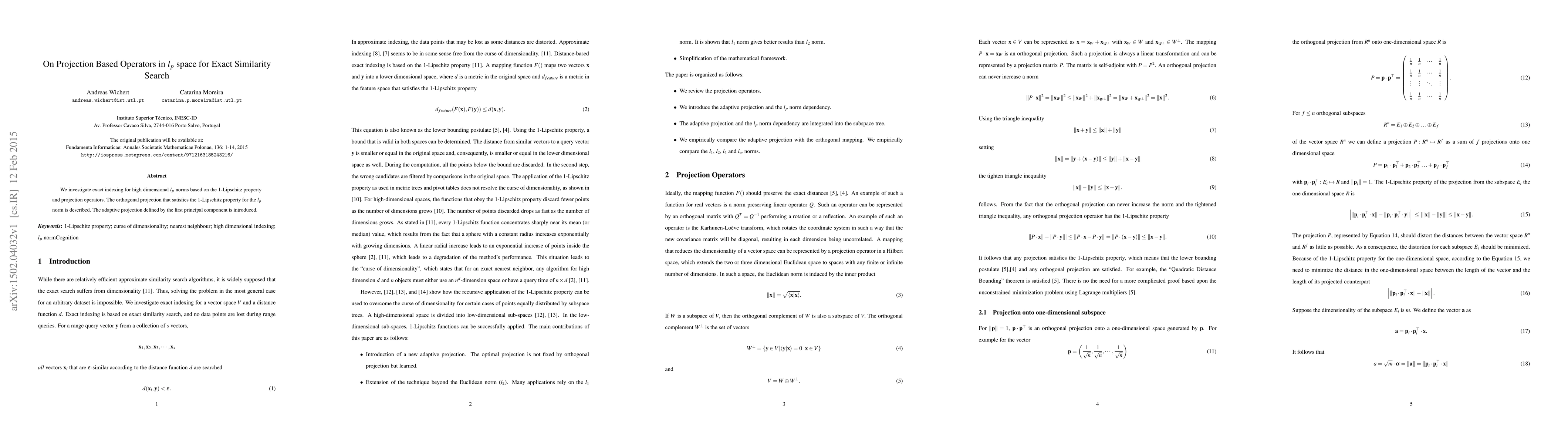 This paper explores exact indexing methods for high-dimensional Lp spaces using projection operators that adhere to the 1-Lipschitz property. It introduces an adaptive projection based on the first principal component for efficient similarity search.