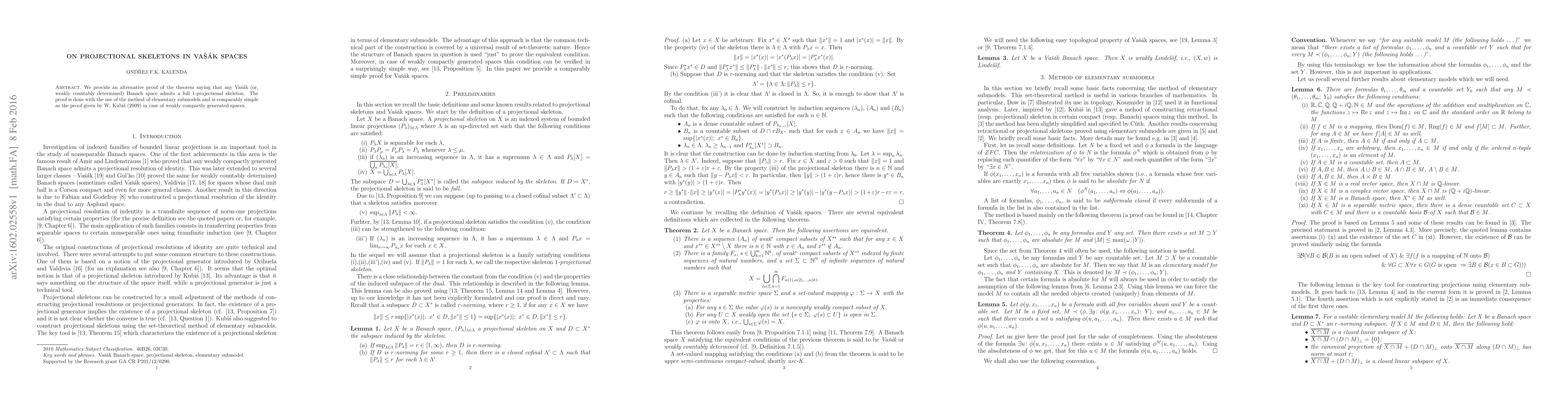 We provide an alternative proof of the theorem saying that any Va\v{s}\'ak (or, weakly countably determined) Banach space admits a full $1$-projectional skeleton. The proof is done with the use of the method of elementary submodels and is comparably simple as the proof given by W.~Kubi\'s (2009) in case of weakly compactly generated spaces.