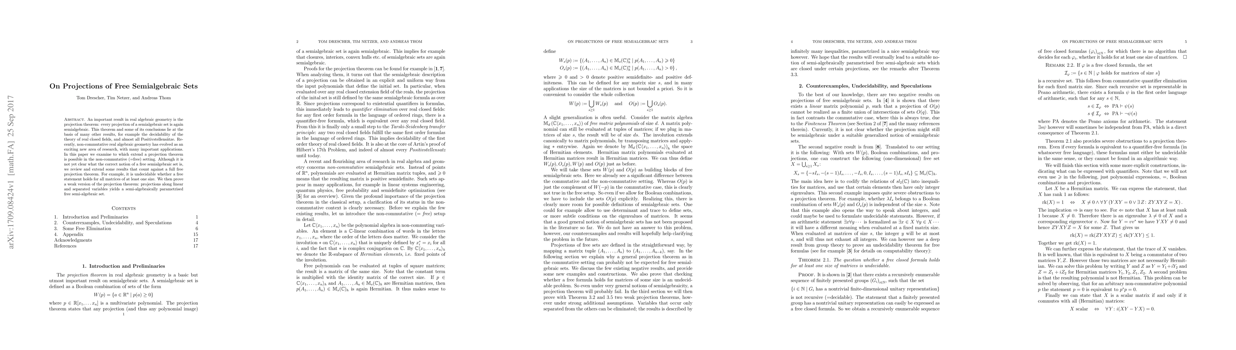 An important result in real algebraic geometry is the projection theorem: every projection of a semialgebraic set is again semialgebraic. This theorem and some of its conclusions lie at the basis of many other results, for example the decidability of the theory of real closed fields, and almost all Positivstellens\"atze. Recently, non-commutative real algebraic geometry has evolved as an exciting new area of research, with many important applications. In this paper we examine to which extend a projection theorem is possible in the non-commutative (=free) setting. Although it is not yet clear what the correct notion of a free semialgebraic set is, we review and extend some results that count against a full free projection theorem. For example, it is undecidable whether a free statement holds for all matrices of at least one size. We then prove a weak version of the projection theorem: projections along linear and separated variables yields a semi-algebraically parametrised free semi-algebraic set.