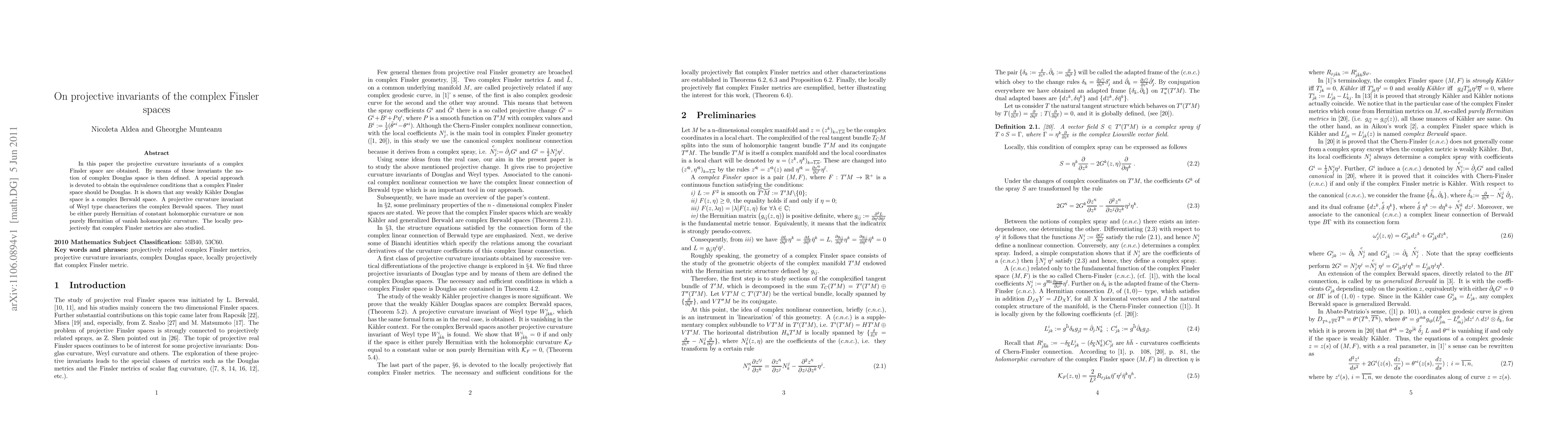 In this paper the projective curvature invariants of a complex Finsler space are obtained. By means of these invariants the notion of complex Douglas space is then defined. A special approach is devoted to obtain the equivalence conditions that a complex Finsler space should be Douglas. It is shown that any weakly K\"{a}hler Douglas space is a complex Berwald space. A projective curvature invariant of Weyl type characterizes the complex Berwald spaces. They must be either purely Hermitian of constant holomorphic curvature or non purely Hermitian of vanish holomorphic curvature. The locally projectively flat complex Finsler metrics are also studied
