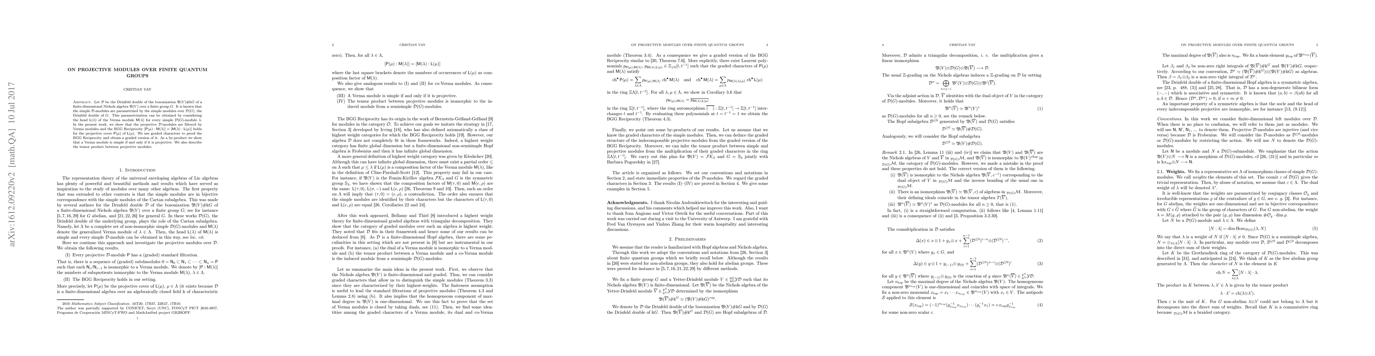 Let $\mathcal{D}$ be the Drinfeld double of the bosonization ${\mathfrak B}(V)\#\Bbbk G$ of a finite-dimensional Nichols algebra ${\mathfrak B}(V)$ over a finite group $G$. It is known that the simple $\mathcal{D}$-modules are parametrized by the simple modules over $\mathcal{D}(G)$, the Drinfeld double of $G$. This parametrization can be obtained by considering the head $\mathsf{L}(\lambda)$ of the Verma module $\mathsf{M}(\lambda)$ for every simple $\mathcal{D}(G)$-module $\lambda$. In the present work, we show that the projective $\mathcal{D}$-modules are filtered by Verma modules and the BGG Reciprocity $[\mathsf{P}(\mu):\mathsf{M}(\lambda)]=[\mathsf{M}(\lambda):\mathsf{L}(\mu)]$ holds for the projective cover $\mathsf{P}(\mu)$ of $\mathsf{L}(\mu)$. We use graded characters to proof the BGG Reciprocity and obtain a graded version of it. Also, we show that a Verma module is simple if and only if it is projective. We also describe the tensor product between projective modules.