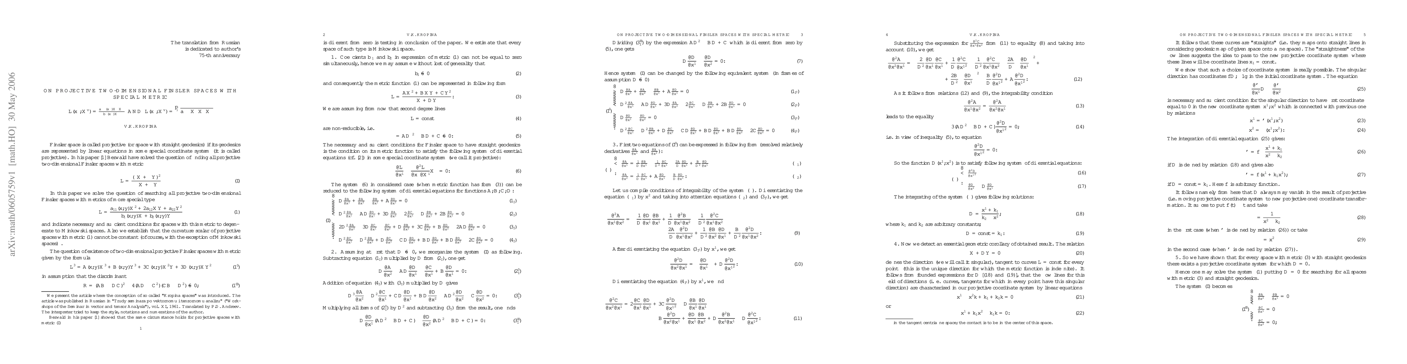 This 1958 Russian paper, translated and published in 1961, introduced a special class of Finsler spaces, now recognized as Kropina spaces, detailing their properties and significance in projective two-dimensional Finsler geometry.