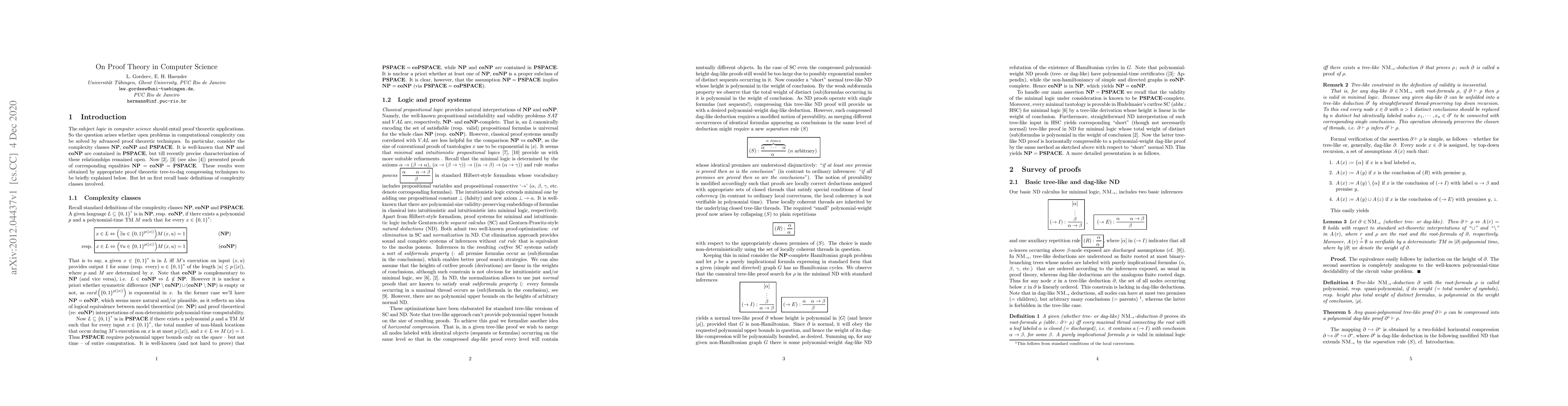 The subject logic in computer science should entail proof theoretic applications. So the question arises whether open problems in computational complexity can be solved by advanced proof theoretic techniques. In particular, consider the complexity classes NP, coNP and PSPACE. It is well-known that NP and coNP are contained in PSPACE, but till recently precise characterization of these relationships remained open. Now [2], [3] (see also [4]) presented proofs of corresponding equalities NP = coNP = PSPACE. These results were obtained by appropriate proof theoretic tree-to-dag compressing techniques to be briefy explained below. [2] L. Gordeev, E. H. Haeusler, Proof Compression and NP Versus PSPACE, Studia Logica (107) (1): 55{83 (2019) [3] L. Gordeev, E. H. Haeusler, Proof Compression and NP Versus PSPACE II, Bulletin of the Section of Logic (49) (3): 213{230 (2020) http://dx.doi.org/10.18788/0138-0680.2020.16 [4] L. Gordeev, E. H. Haeusler, Proof Compression and NP Versus PSPACE II: Addendum, arXiv:2011.09262 (2020)