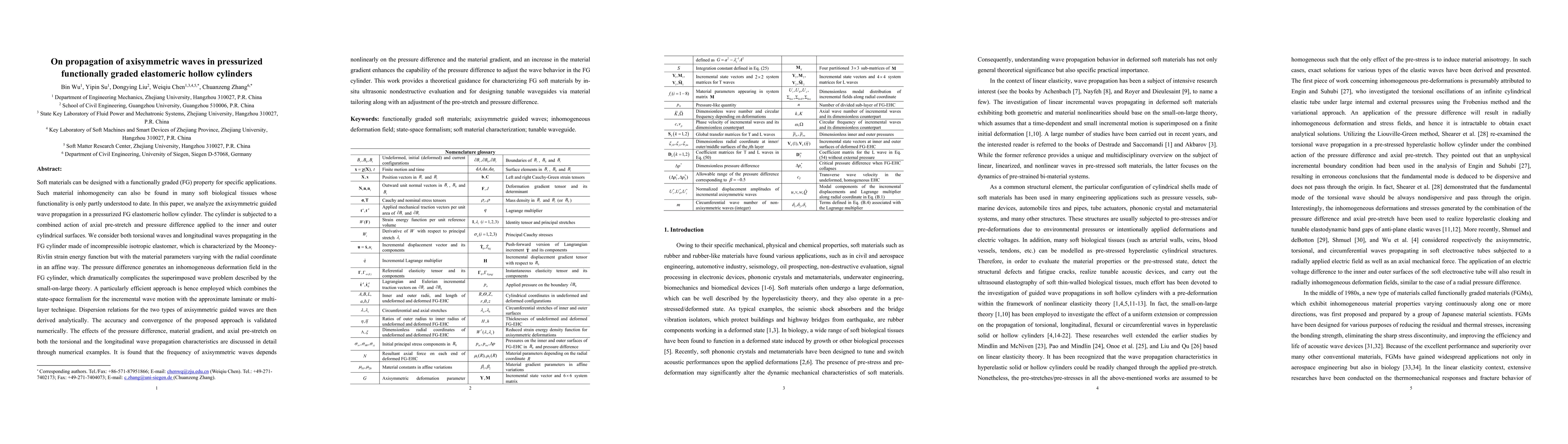 Soft materials can be designed with a functionally graded (FG) property for specific applications. In this paper, we analyze the axisymmetric guided wave propagation in a pressurized FG elastomeric hollow cylinder. The cylinder is subjected to a combined action of axial pre-stretch and pressure difference applied to the inner and outer cylindrical surfaces. We consider both torsional waves and longitudinal waves propagating in the FG cylinder made of incompressible isotropic elastomer, which is characterized by the Mooney-Rivlin strain energy function but with the material parameters varying with the radial coordinate in an affine way. The pressure difference generates an inhomogeneous deformation field in the FG cylinder, which dramatically complicates the superimposed wave problem described by the small-on-large theory. A particularly efficient approach is hence employed which combines the state-space formalism for the incremental wave motion with the approximate laminate or multi-layer technique. Dispersion relations for the two types of axisymmetric guided waves are then derived analytically. The accuracy and convergence of the proposed approach is validated numerically. The effects of the pressure difference, material gradient, and axial pre-stretch on both the torsional and the longitudinal wave propagation characteristics are discussed in detail through numerical examples. It is found that the frequency of axisymmetric waves depends nonlinearly on the pressure difference and the material gradient, and an increase in the material gradient enhances the capability of the pressure difference to adjust the wave behavior in the FG cylinder.