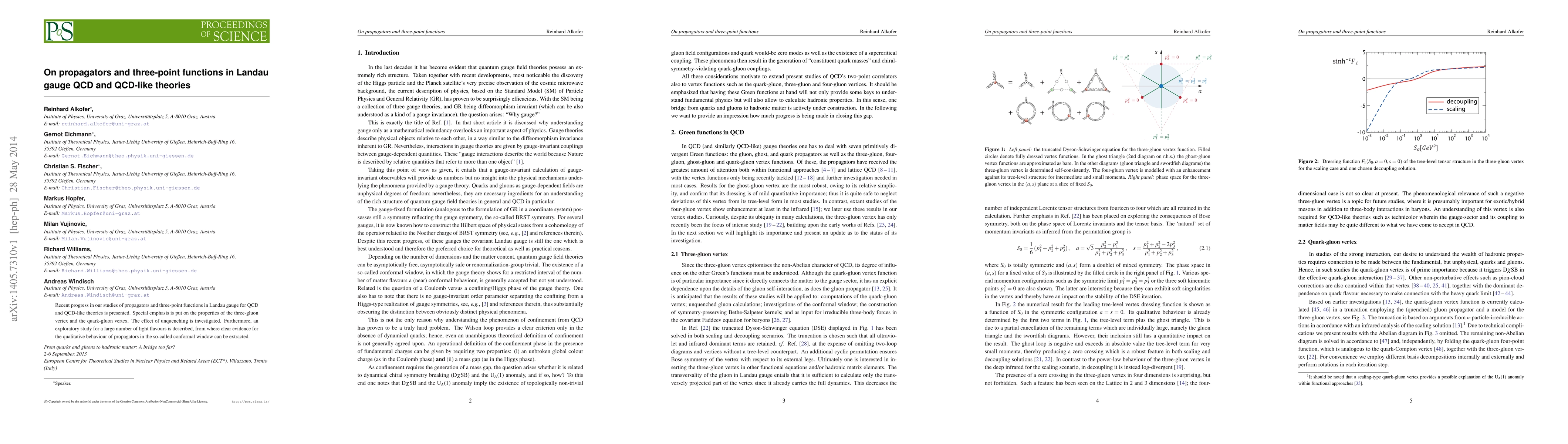 This paper discusses recent advancements in studying propagators and three-point functions in Landau gauge QCD and QCD-like theories, focusing on the three-gluon and quark-gluon vertices. It also explores the impact of unquenching and investigates the behavior of propagators in the conformal window for a large number of light flavors.