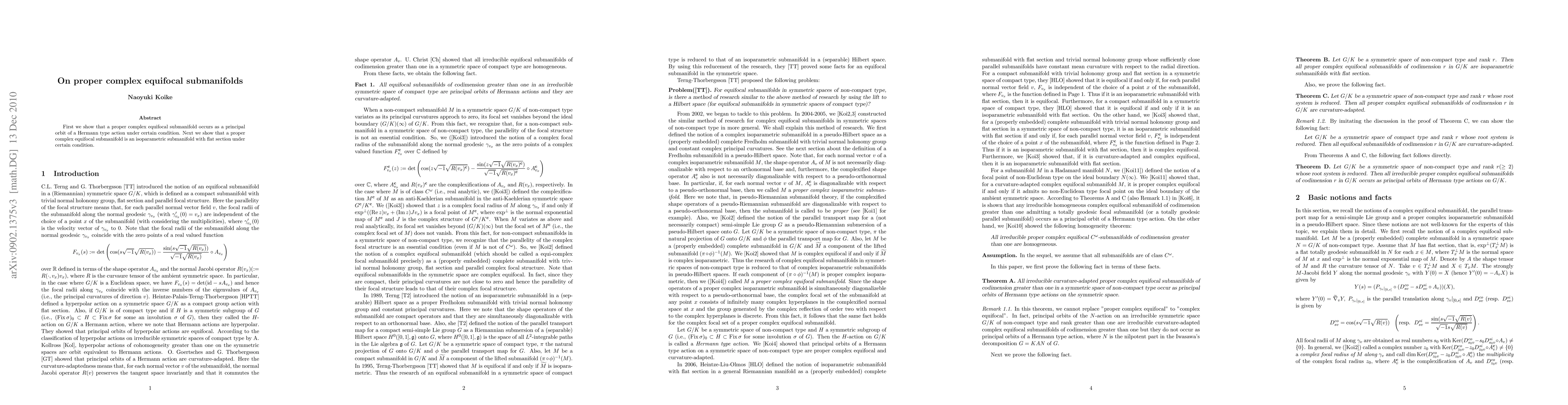 This paper shows that proper complex equifocal submanifolds can be classified as principal orbits under specific conditions and also identified as curvature-adapted under certain conditions.