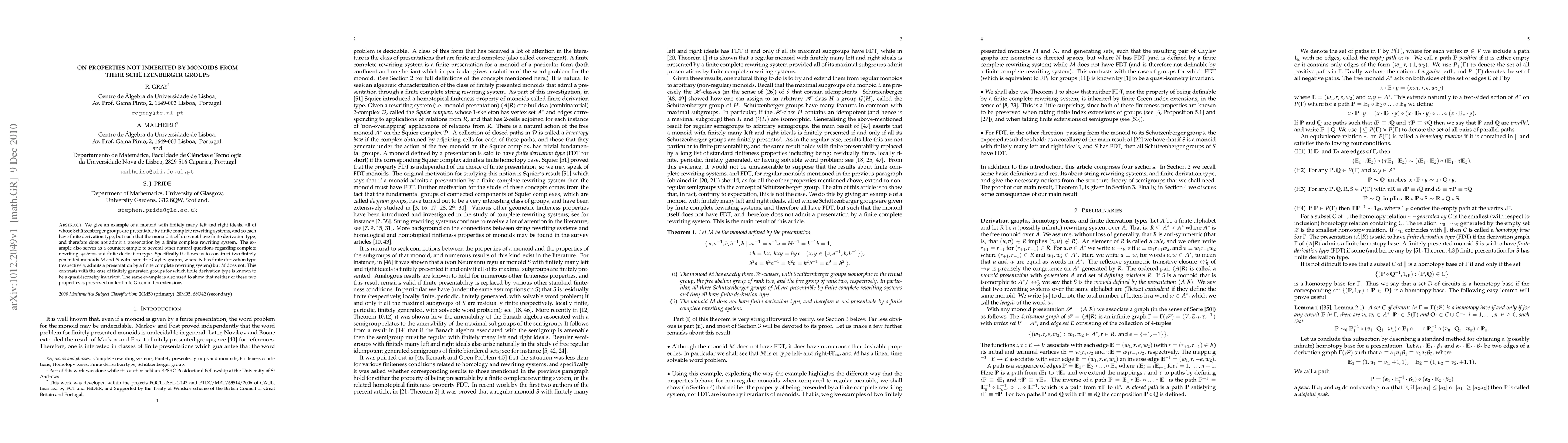 We give an example of a monoid with finitely many left and right ideals, all of whose Schutzenberger groups are presentable by finite complete rewriting systems, and so each have finite derivation type, but such that the monoid itself does not have finite derivation type, and therefore does not admit a presentation by a finite complete rewriting system. The example also serves as a counterexample to several other natural questions regarding complete rewriting systems and finite derivation type. Specifically it allows us to construct two finitely generated monoids M and N with isometric Cayley graphs, where N has finite derivation type (respectively, admits a presentation by a finite complete rewriting system) but M does not. This contrasts with the case of finitely generated groups for which finite derivation type is known to be a quasi-isometry invariant. The same example is also used to show that neither of these two properties is preserved under finite Green index extensions.