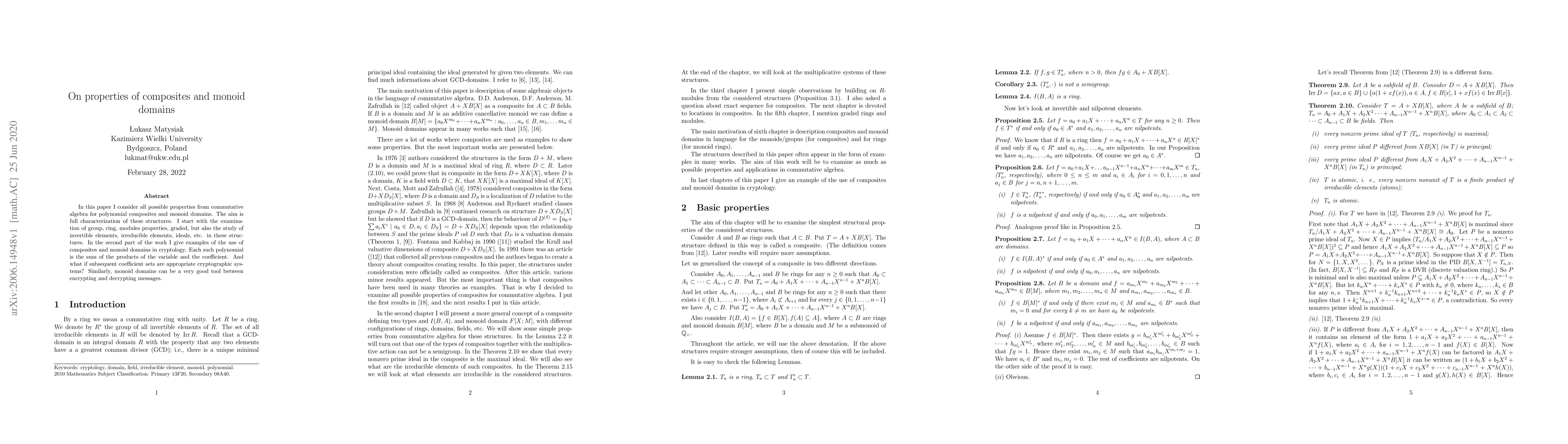 In this paper I consider all possible properties from commutative algebra for polynomial composites and monoid domains. The aim is full characterization of these structures. I start with the examination of group, ring, modules properties, graded, but also the study of invertible elements, irreducible elements, ideals, etc. in these structures. In the second part of the work I give examples of the use of composites and monoid domains in cryptology. Each such polynomial is the sum of the products of the variable and the coefficient. And what if subsequent coefficient sets are appropriate cryptographic systems? Similarly, monoid domains can be a very good tool between encrypting and decrypting messages.