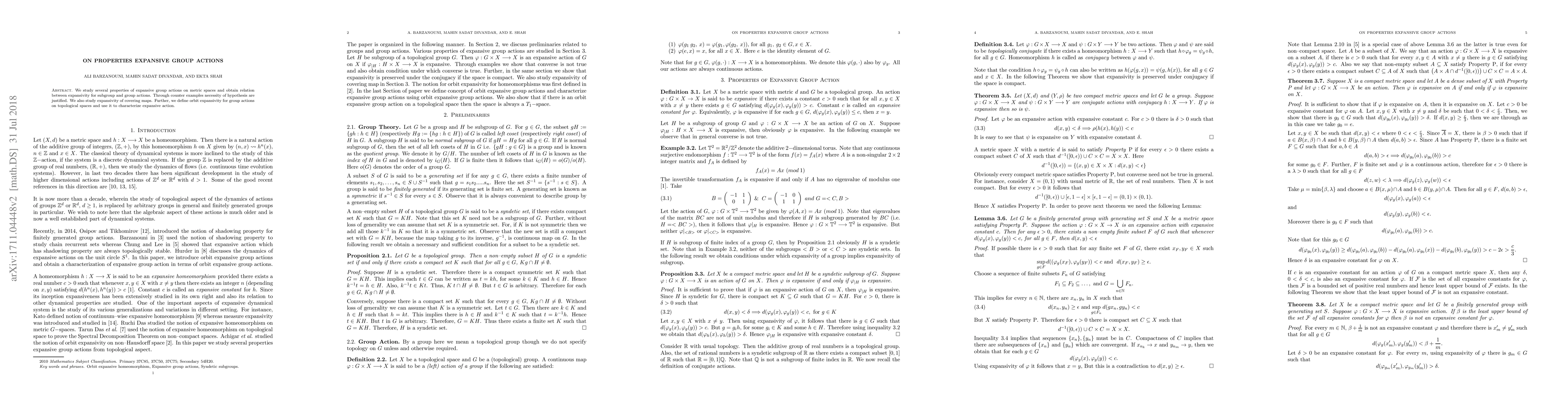 The paper studies properties of expansive group actions on metric spaces, establishing relationships between subgroup and group expansivity, and providing counterexamples to justify hypothesis necessity.
