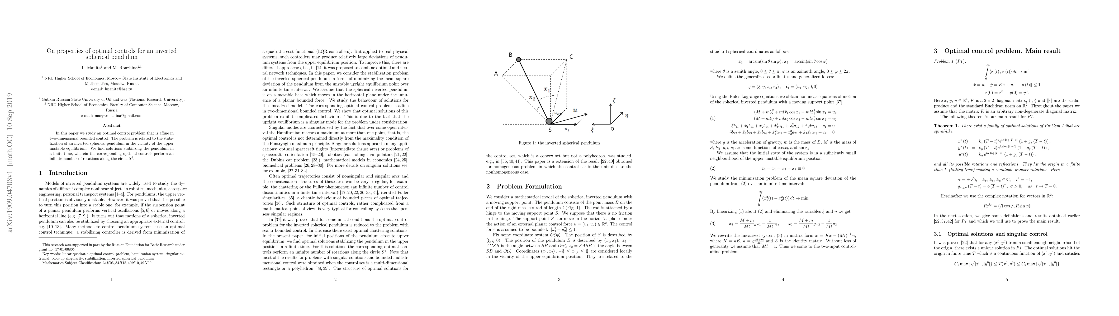 This paper investigates optimal control strategies for stabilizing an inverted spherical pendulum near its unstable equilibrium, finding finite-time solutions that involve the pendulum performing an infinite number of rotations. The control is affine and operates within a two-dimensional bounded space.