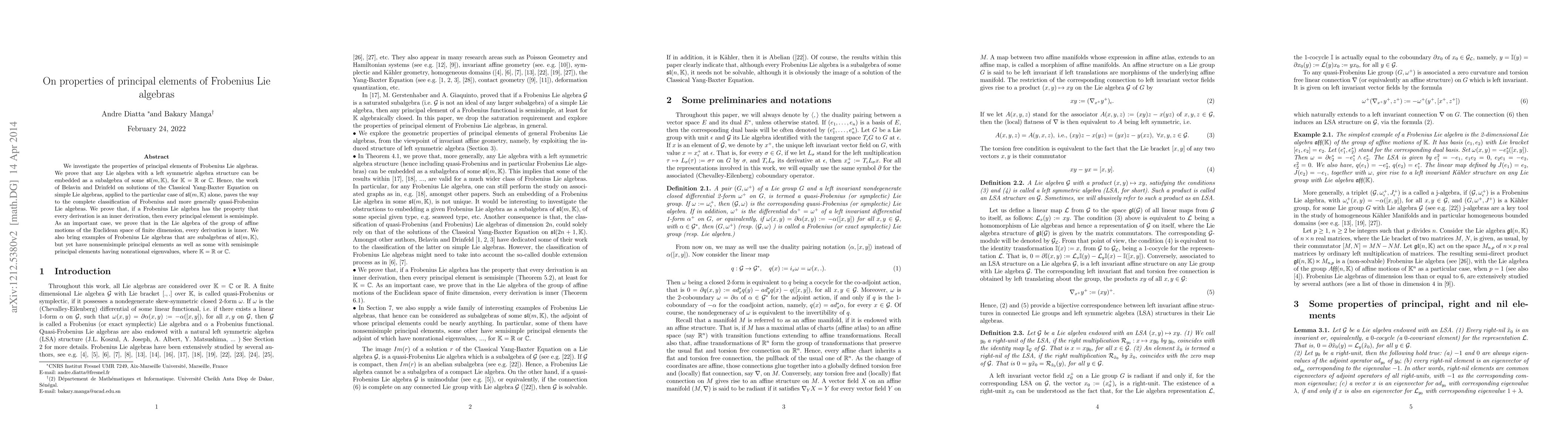 We investigate the properties of principal elements of Frobenius Lie algebras, following the work of M. Gerstenhaber and A. Giaquinto. We prove that any Lie algebra with a left symmetric algebra structure can be embedded, in a natural way, as a subalgebra of some sl(m,K), for K= R or C. Hence, the work of Belavin and Drinfeld on solutions of the Classical Yang-Baxter Equation on simple Lie algebras, applied to the particular case of sl(m, K) alone, paves the way to the complete classification of Frobenius and more generally quasi-Frobenius Lie algebras. We prove that, if a Frobenius Lie algebra has the property that every derivation is an inner derivation, then every principal element is semisimple, at least for K=C. As an important case, we prove that in the Lie algebra of the group of affine motions of the Euclidean space of finite dimension, every derivation is inner. We also bring a class of examples of Frobenius Lie algebras, that hence are subalgebras of sl(m, K), but yet have nonsemisimple principal elements as well as some with semisimple principal elements having nonrational eigenvalues, where K=R or C.