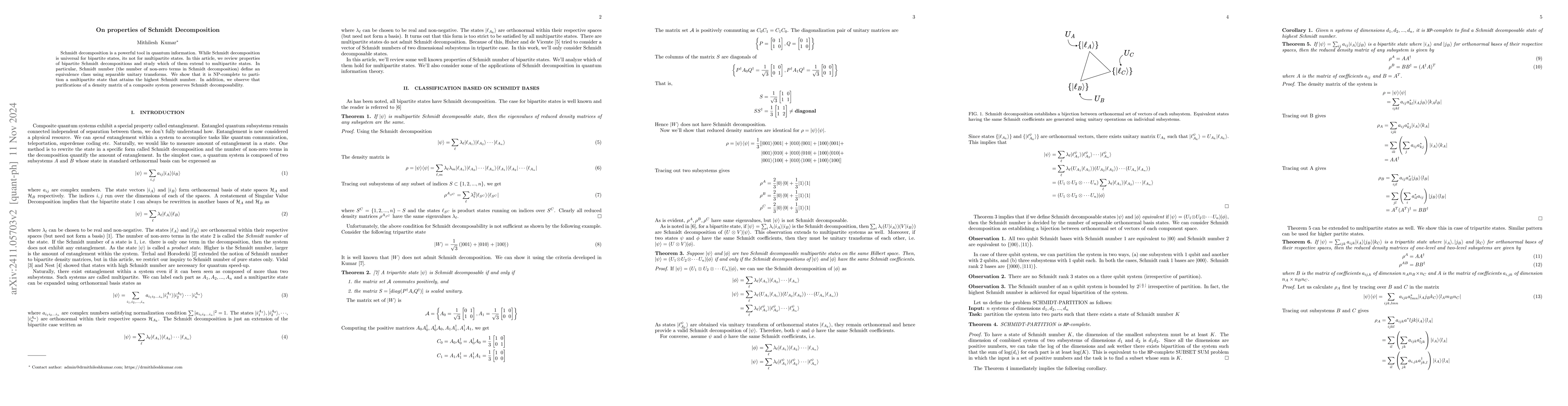 Summary: This paper reviews the properties of bipartite Schmidt decompositions and investigates their extension to multipartite states, highlighting that the Schmidt number defines an equivalence class. It demonstrates the computational complexity of partitioning multipartite states with the highest Schmidt number and notes that purifications preserve Schmidt decomposability.