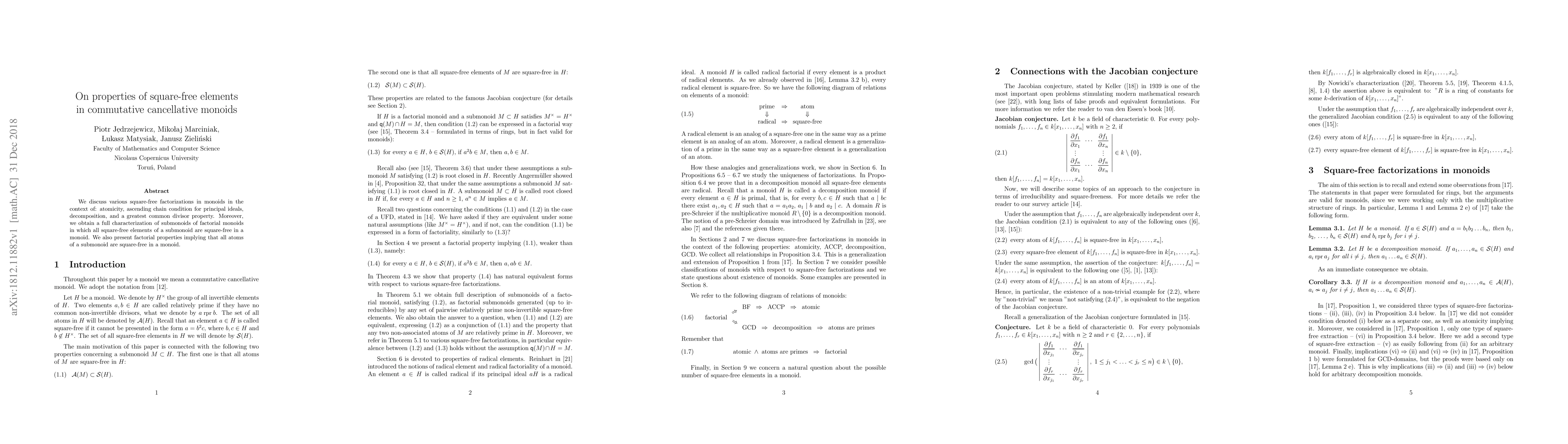 We discuss various square-free factorizations in monoids in the context of: atomicity, ascending chain condition for principal ideals, decomposition, and a greatest common divisor property. Moreover, we obtain a full characterization of submonoids of factorial monoids in which all square-free elements of a submonoid are square-free in a monoid. We also present factorial properties implying that all atoms of a submonoid are square-free in a monoid.