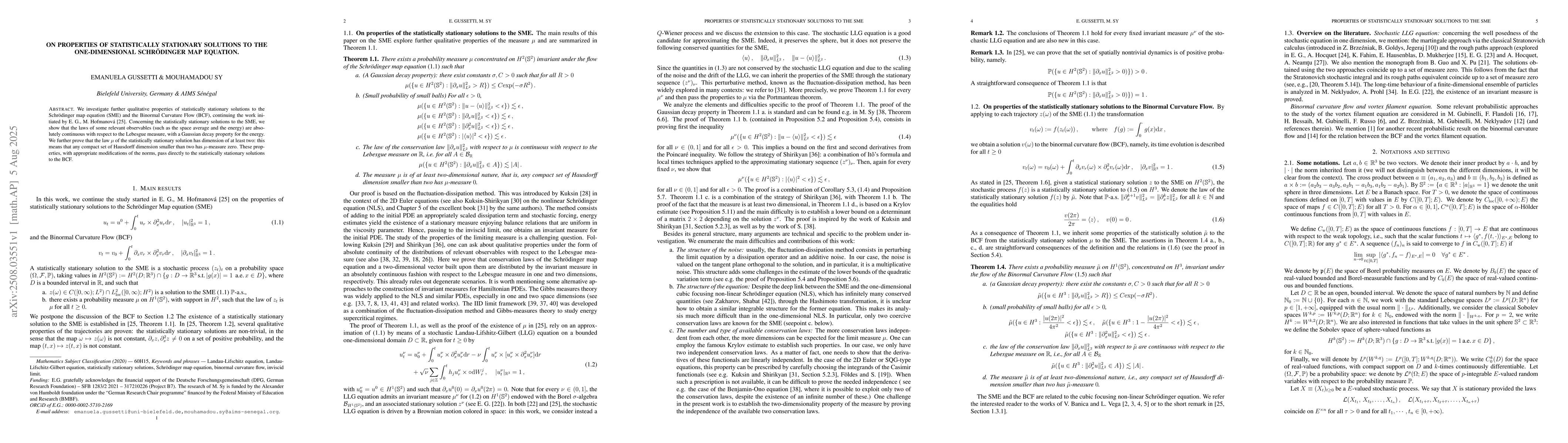 The research investigates the properties of statistically stationary solutions to the one-dimensional Schrödinger map equation (SME) and Binormal Curvature Flow (BCF), building on previous work by E. G. and M. Hofmanová.