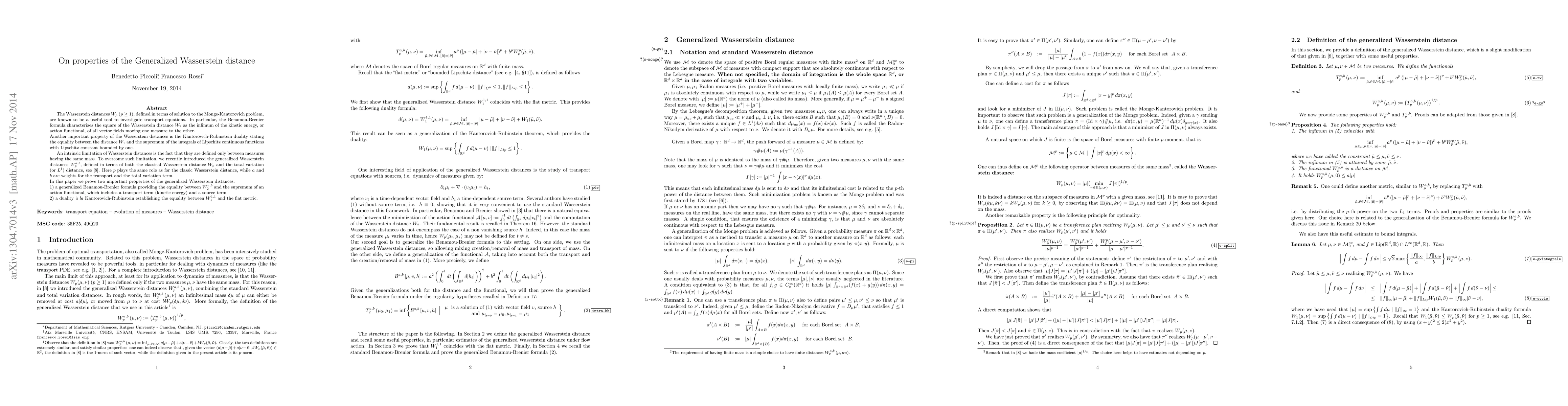 This paper introduces the generalized Wasserstein distances $W_p^{a,b}$ to overcome the limitation of classic Wasserstein distances, which require measures of equal mass. It proves two key properties: a generalized Benamou-Brenier formula for $W_2^{a,b}$ and a Kantorovich-Rubinstein duality for $W_1^{1,1}$.