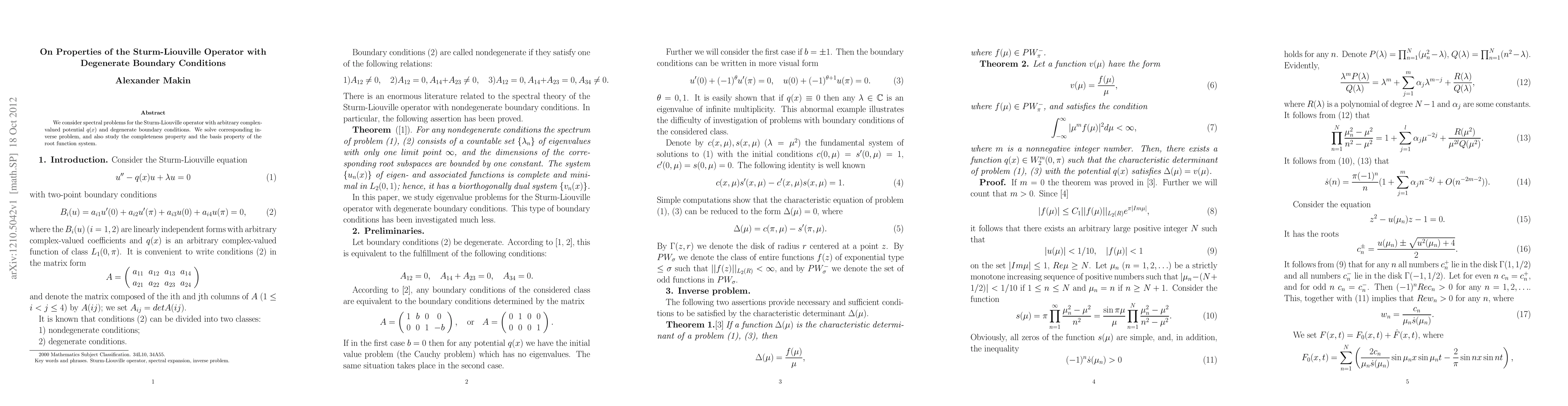 We consider spectral problems for the Sturm-Liouville operator with arbitrary complex-valued potential q(x) and degenerate boundary conditions. We solve corresponding inverse problem, and also study the completeness property and the basis property of the root function system.