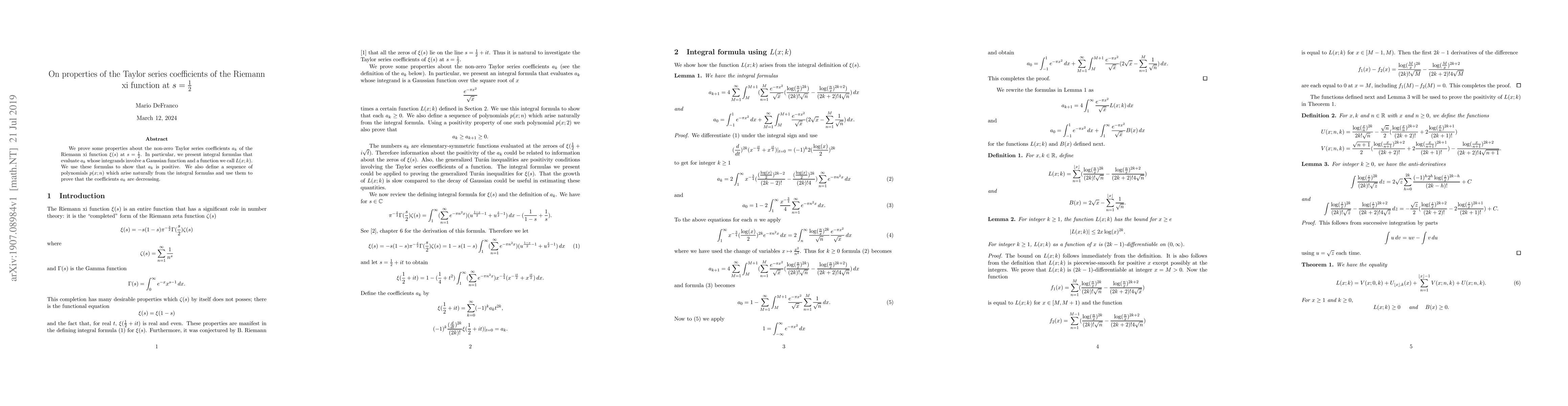 This paper investigates the non-zero Taylor series coefficients $a_k$ of the Riemann xi function $\xi(s)$ at $s=\frac{1}{2}$, proving they are positive and decreasing. Integral formulas involving a Gaussian function and a new function $L(x;k)$ are used to establish these properties.