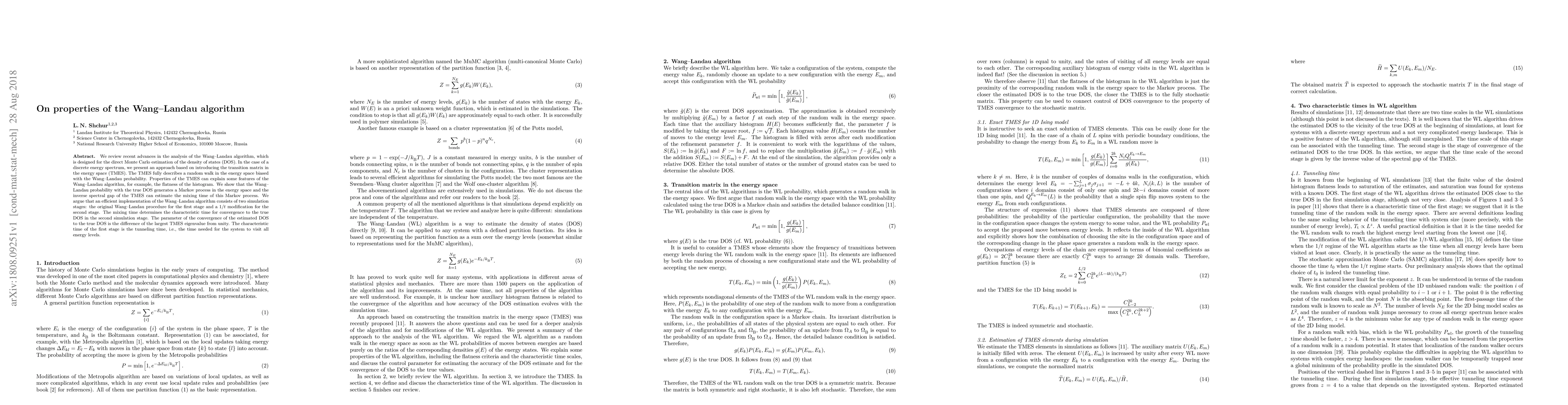 We review recent advances in the analysis of the Wang--Landau algorithm, which is designed for the direct Monte Carlo estimation of the density of states (DOS). In the case of a discrete energy spectrum, we present an approach based on introducing the transition matrix in the energy space (TMES). The TMES fully describes a random walk in the energy space biased with the Wang-Landau probability. Properties of the TMES can explain some features of the Wang-Landau algorithm, for example, the flatness of the histogram. We show that the Wang--Landau probability with the true DOS generates a Markov process in the energy space and the inverse spectral gap of the TMES can estimate the mixing time of this Markov process. We argue that an efficient implementation of the Wang-Landau algorithm consists of two simulation stages: the original Wang-Landau procedure for the first stage and a $1/t$ modification for the second stage. The mixing time determines the characteristic time for convergence to the true DOS in the second simulation stage. The parameter of the convergence of the estimated DOS to the true DOS is the difference of the largest TMES eigenvalue from unity. The characteristic time of the first stage is the tunneling time, i.e., the time needed for the system to visit all energy levels.