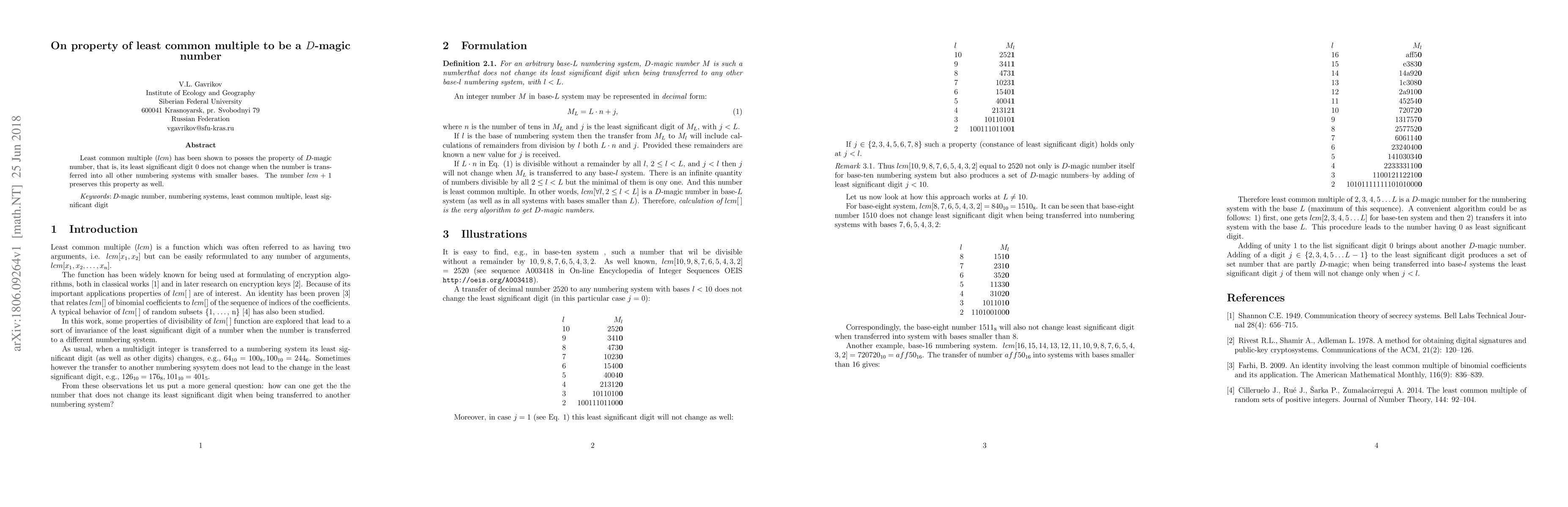 Least common multiple ($lcm$) has been shown to posses the property of $D$-magic number, that is, its least significant digit $0$ does not change when the number is transferred into all other numbering systems with smaller bases. The number $lcm + 1$ preserves this property as well.