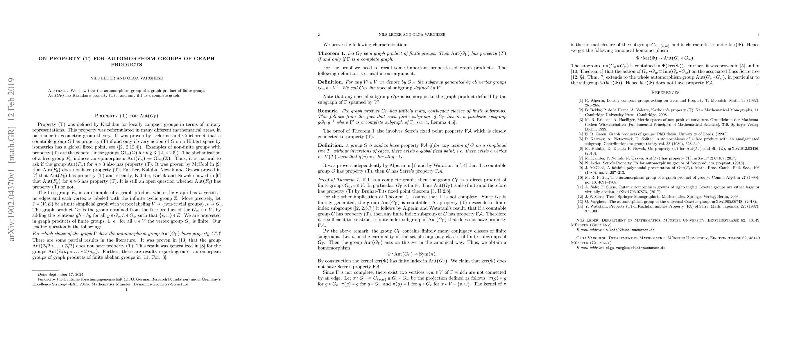 Summary: This paper demonstrates that the automorphism group of a graph product of finite groups possesses Kazhdan's property (T) if and only when the underlying graph is complete. This result highlights a strong connection between graph structure and group properties.