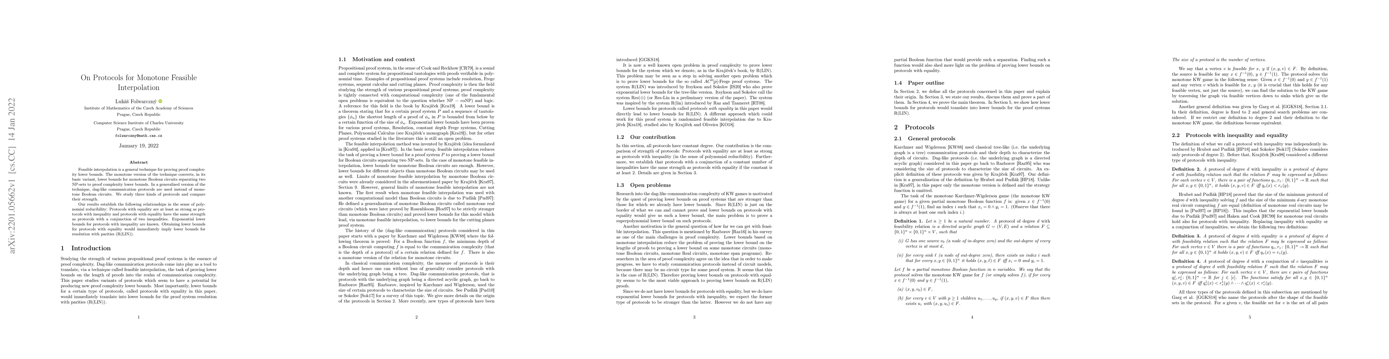 This paper explores feasible interpolation protocols for proving proof complexity lower bounds, focusing on monotone versions that convert lower bounds for monotone Boolean circuits to such bounds. It compares three types of protocols, establishing that protocols with equality are at least as strong as those with inequality and are equivalent to protocols with a conjunction of two inequalities.