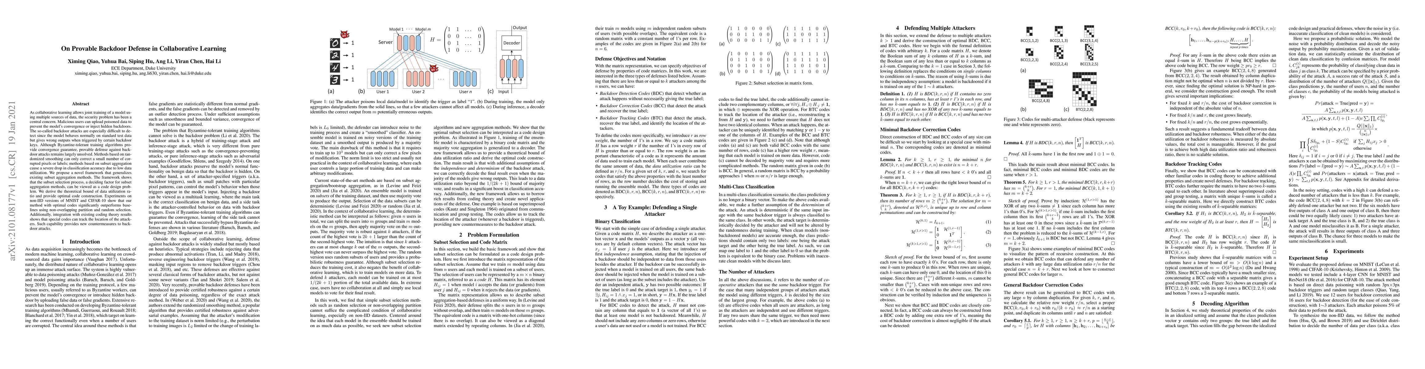 This paper proposes a novel framework for provably defending against backdoor attacks in collaborative learning, showing improved performance over existing methods through optimal code construction and data utilization ratio.