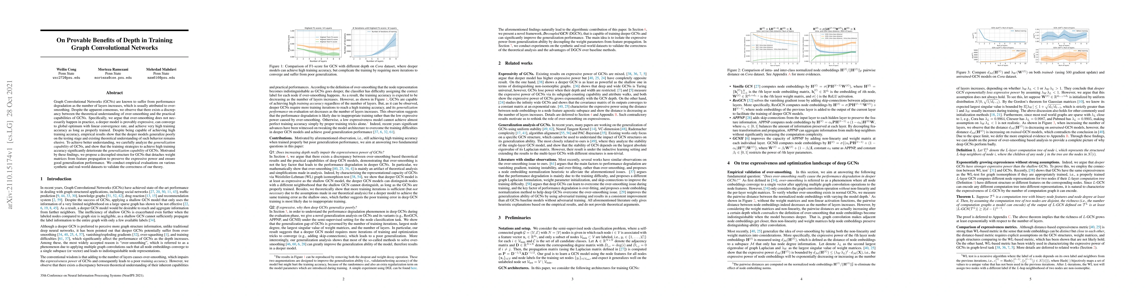 Deeper Graph Convolutional Networks can achieve high training accuracy but poorly generalize to testing data, a phenomenon not explained by existing theoretical understanding. A new decoupled structure improves generalization performance while preserving expressiveness.