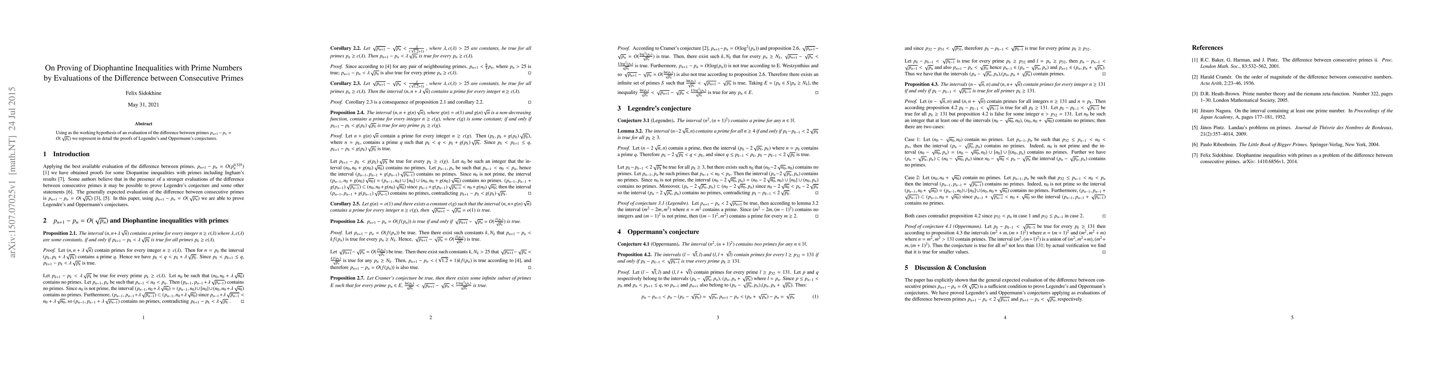 Using as the working hypothesis of an evaluation of the difference between primes $p_{n+1} - p_n = O(\sqrt{p_n})$ we represent in detail the proofs of Legendre's and Oppermann's conjectures.