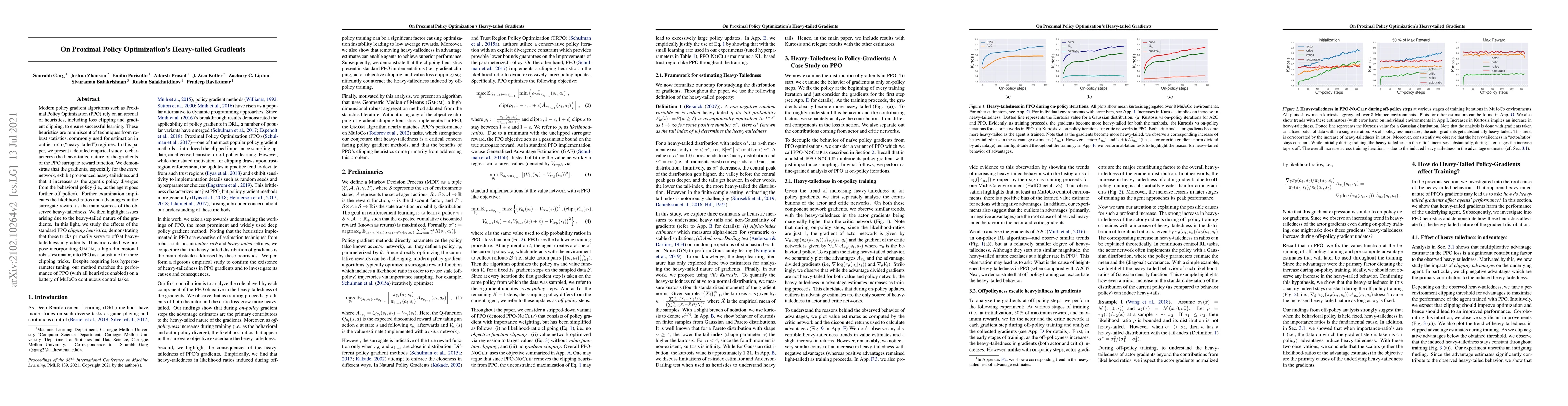 This paper investigates the heavy-tailed nature of Proximal Policy Optimization (PPO) gradients, finding that they exhibit pronounced heavy-tailedness, especially when the agent's policy diverges from the behavioral policy. The authors propose GMOM as a robust alternative to standard clipping heuristics, achieving comparable performance on MuJoCo tasks.