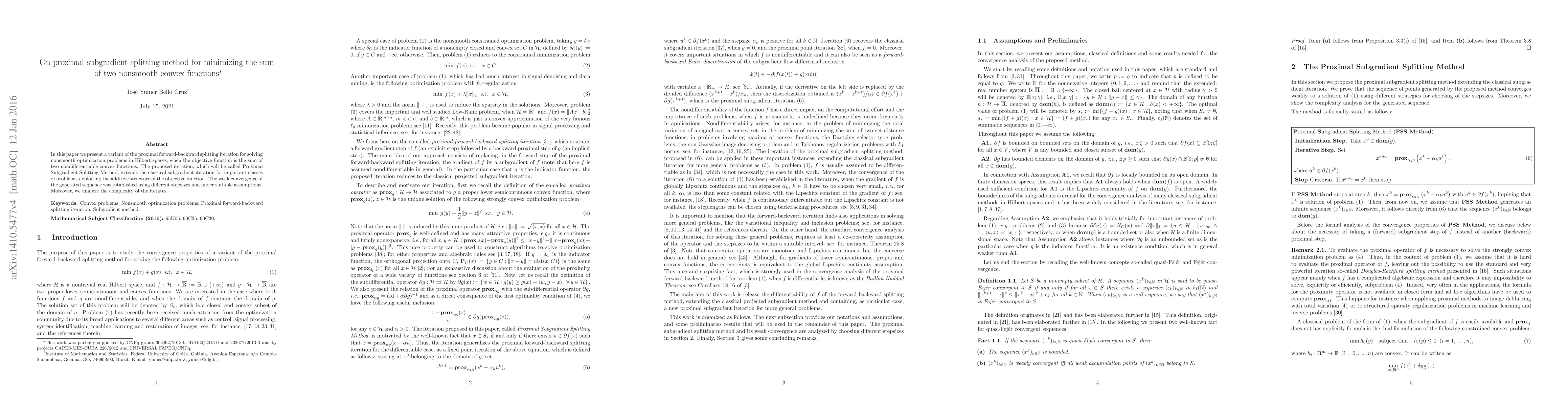 In this paper we present a variant of the proximal forward-backward splitting iteration for solving nonsmooth optimization problems in Hilbert spaces, when the objective function is the sum of two nondifferentiable convex functions. The proposed iteration, which will be called Proximal Subgradient Splitting Method, extends the classical subgradient iteration for important classes of problems, exploiting the additive structure of the objective function. The weak convergence of the generated sequence was established using different stepsizes and under suitable assumptions. Moreover, we analyze the complexity of the iterates.