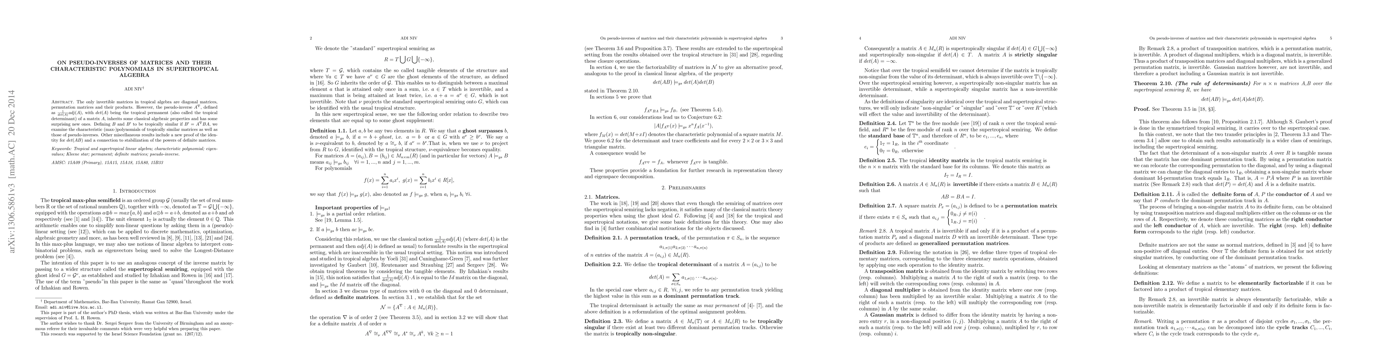 This paper explores pseudo-inverses in supertropical algebra, revealing new properties of matrices and their characteristic polynomials. It introduces a pseudo-inverse defined via the tropical permanent and examines the implications for tropically similar matrices, along with new proofs and connections to definite matrix powers.