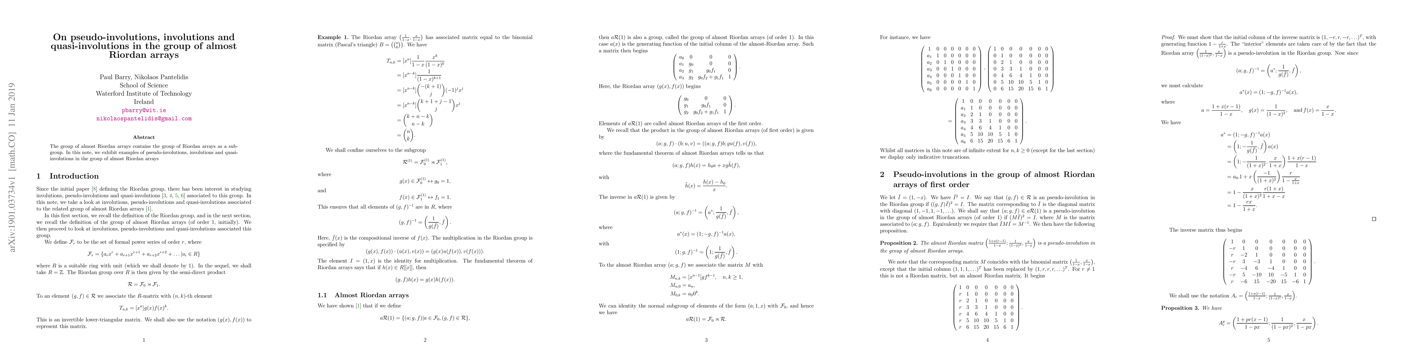 The group of almost Riordan arrays contains the group of Riordan arrays as a subgroup. In this note, we exhibit examples of pseudo-involutions, involutions and quasi-involutions in the group of almost Riordan arrays.