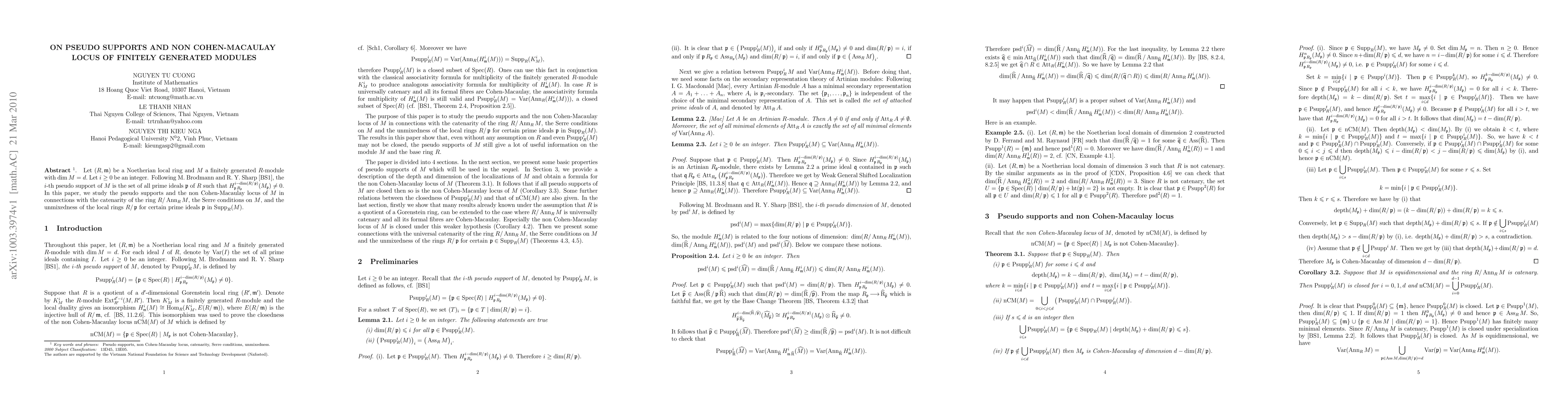 Let $(R,\m)$ be a Noetherian local ring and $M$ a finitely generated $R$-module with $\dim M=d.$ Let $i\geq 0$ be an integer. Following M. Brodmann and R. Y. Sharp \cite{BS1}, the $i$-th pseudo support of $M$ is the set of all prime ideals $\p$ of $R$ such that $ H^{i-\dim (R/\p)}_{\p R_{\p}}(M_{\p})\neq 0.$ In this paper, we study the pseudo supports and the non Cohen-Macaulay locus of $M$ in connections with the catenarity of the ring $R/\Ann_RM$, the Serre conditions on $M$, and the unmixedness of the local rings $R/\p$ for certain prime ideals $\p$ in $\Supp_R (M)$.