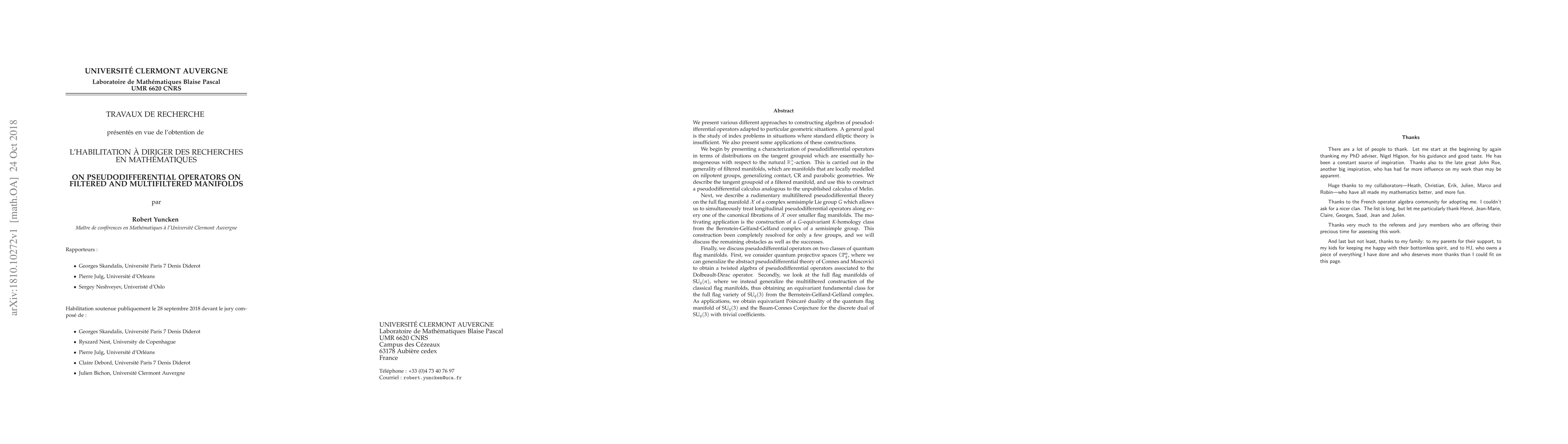 This memoir is a summary of recent work, including collaborations with Erik van Erp, Christian Voigt and Marco Matassa, compiled for the "Habilitation \`a diriger des recherches". We present various different approaches to constructing algebras of pseudodifferential operators adapted to filtered and multifiltered manifolds and some quantum analogues. A general goal is the study of index problems in situations where standard elliptic theory is insufficient. We also present some applications of these constructions. We begin by presenting a characterization of pseudodifferential operators on filtered manifolds in terms of distributions on the tangent groupoid which are essentially homogeneous with respect to the natural $\mathbb{R}^\times_+$-action. Next, we describe a rudimentary multifiltered pseudodifferential theory on the full flag manifold $\mathcal{X}$ of a complex semisimple Lie group $G$ which allows us to simultaneously treat longitudinal pseudodifferential operators along every one of the canonical fibrations of $\mathcal{X}$ over smaller flag manifolds. The motivating application is the construction of a $G$-equivariant $K$-homology class from the Bernstein-Gelfand-Gelfand complex of a semisimple group. Finally, we discuss pseudodifferential operators on two classes of quantum flag manifolds: quantum projective spaces and the full flag manifolds of $SU_q(n)$. In particular, on the full flag variety of $SU_q(3)$ we obtain an equivariant fundamental class from the Bernstein-Gelfand-Gelfand complex.