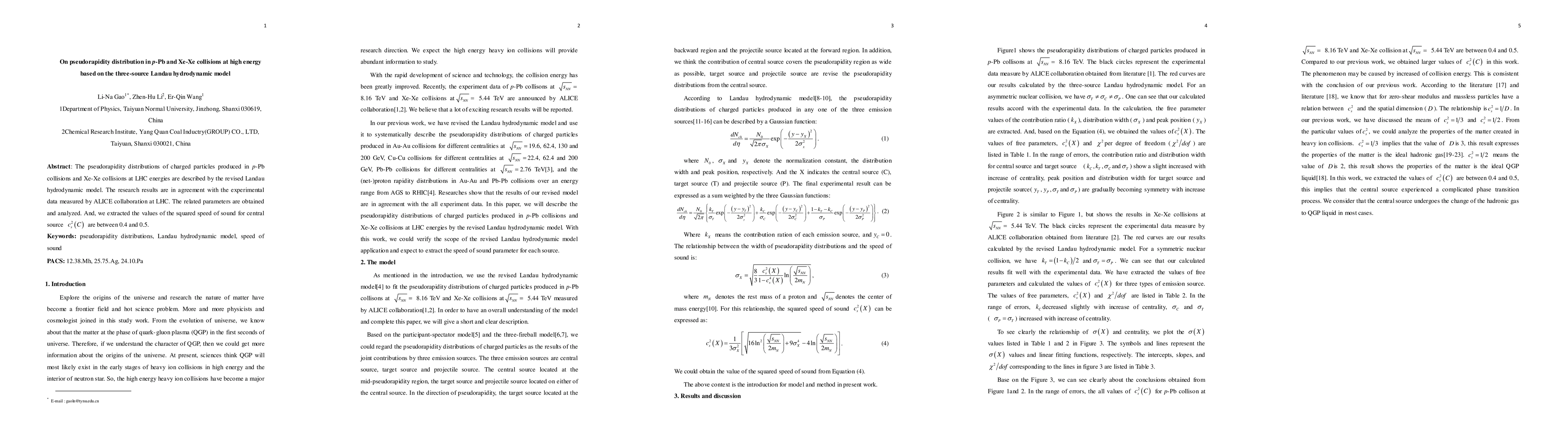 Summary: This study uses a revised Landau hydrodynamic model to describe pseudorapidity distributions in p-Pb and Xe-Xe collisions at LHC energies, aligning with ALICE experimental data. The analysis yields values for the squared speed of sound in the central source ranging from 0.4 to 0.5.