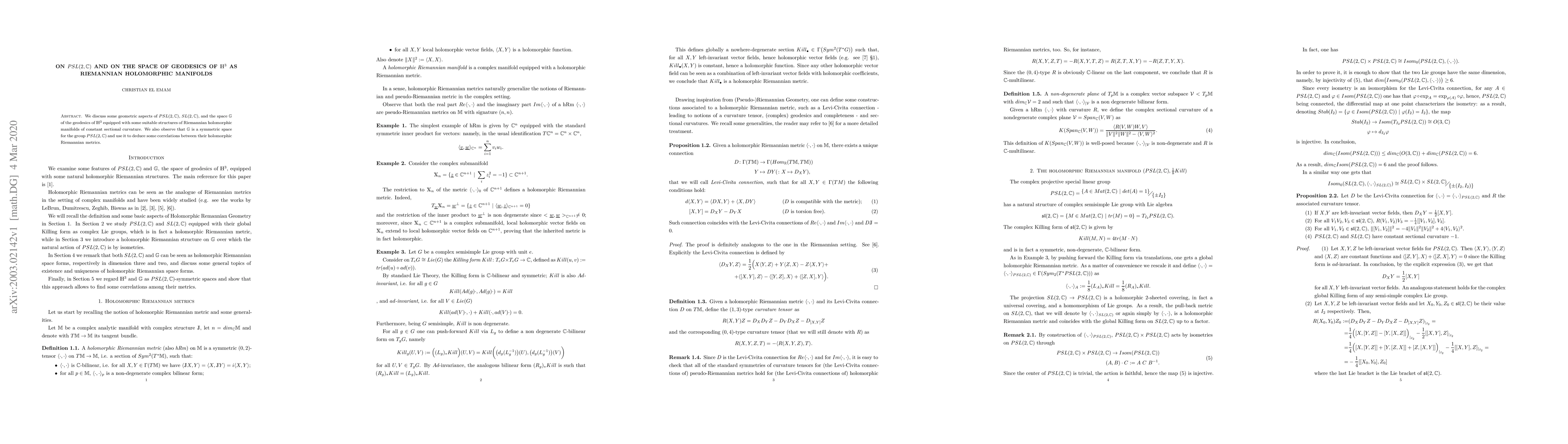 We discuss some geometric aspects of PSL(2,C), SL(2,C), and the space G of the geodesics of H^3 equipped with some suitable structures of Riemannian holomorphic manifolds of constant sectional curvature. We also observe that G is a symmetric space for the group PSL(2,C) and use it to deduce some correlations between their holomorphic Riemannian metrics.