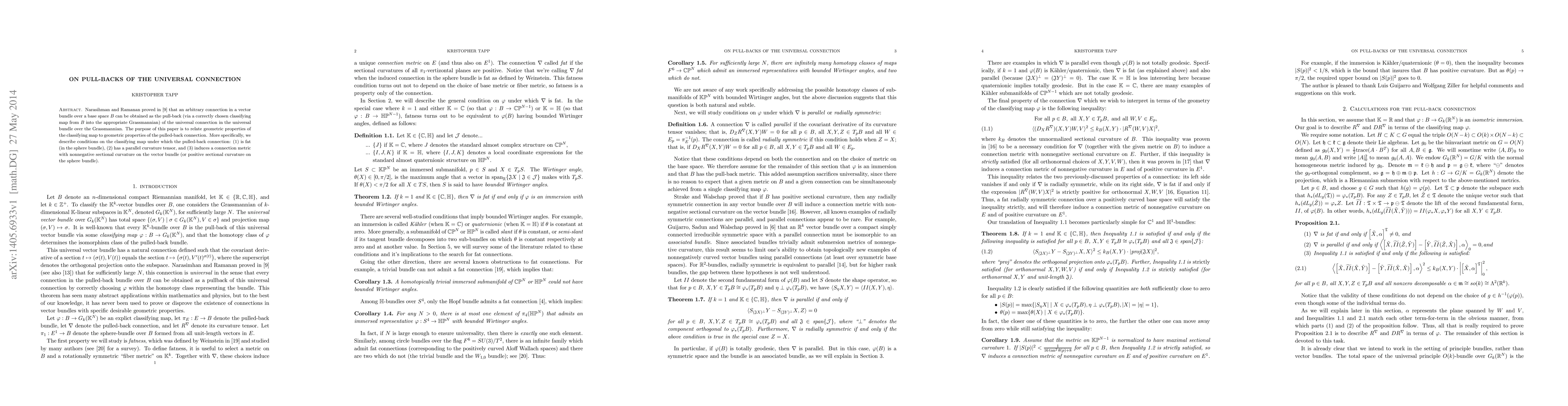 Narasihman and Ramanan proved that an arbitrary connection in a vector bundle over a base space B can be obtained as the pull-back (via a correctly chosen classifying map from B into the appropriate Grassmannian) of the universal connection in the universal bundle over the Grassmannian. The purpose of this paper is to relate geometric properties of the classifying map to geometric properties of the pulled-back connection. More specifically, we describe conditions on the classifying map under which the pulled-back connection: (1) is fat (in the sphere bundle), (2) has a parallel curvature tensor, and (3) induces a connection metric with nonnegative sectional curvature on the vector bundle (or positive sectional curvature on the sphere bundle).