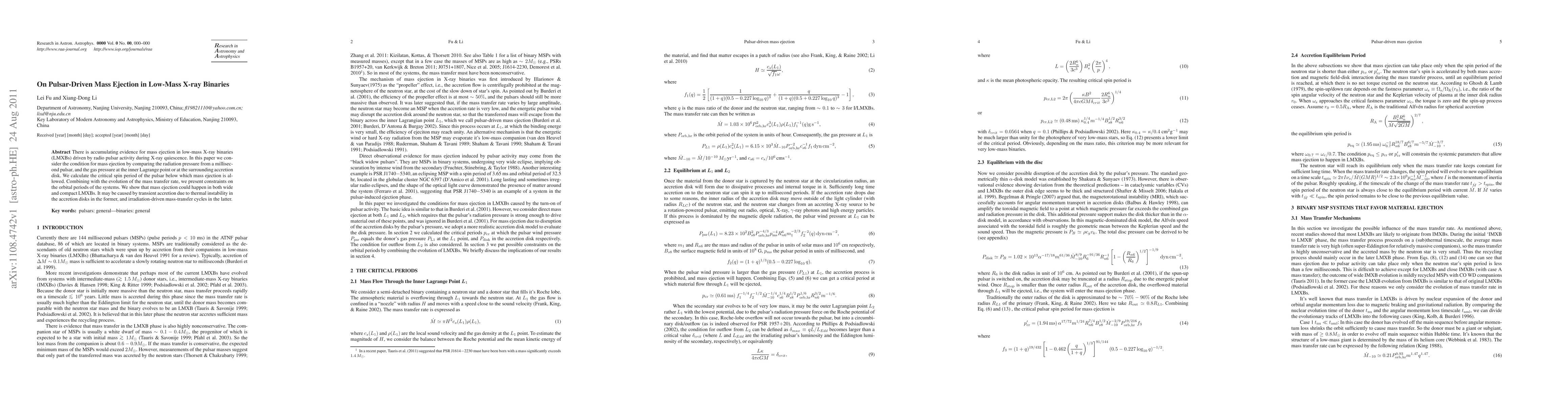 This paper investigates mass ejection in low-mass X-ray binaries (LMXBs) driven by millisecond pulsar activity during X-ray quiescence, determining the critical pulsar spin period for mass ejection. It finds that mass ejection can occur in both wide and compact LMXBs due to different mechanisms: thermal instability in accretion disks and irradiation-driven cycles.