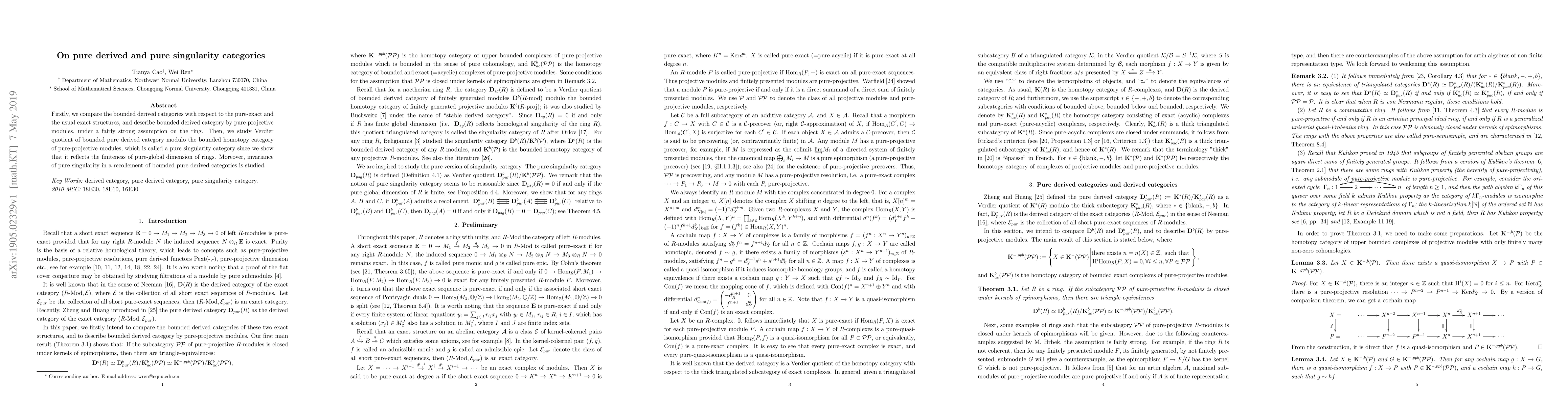 Firstly, we compare the bounded derived categories with respect to the pure-exact and the usual exact structures, and describe bounded derived category by pure-projective modules, under a fairly strong assumption on the ring. Then, we study Verdier quotient of bounded pure derived category modulo the bounded homotopy category of pure-projective modules, which is called a pure singularity category since we show that it reflects the finiteness of pure-global dimension of rings. Moreover, invariance of pure singularity in a recollement of bounded pure derived categories is studied.