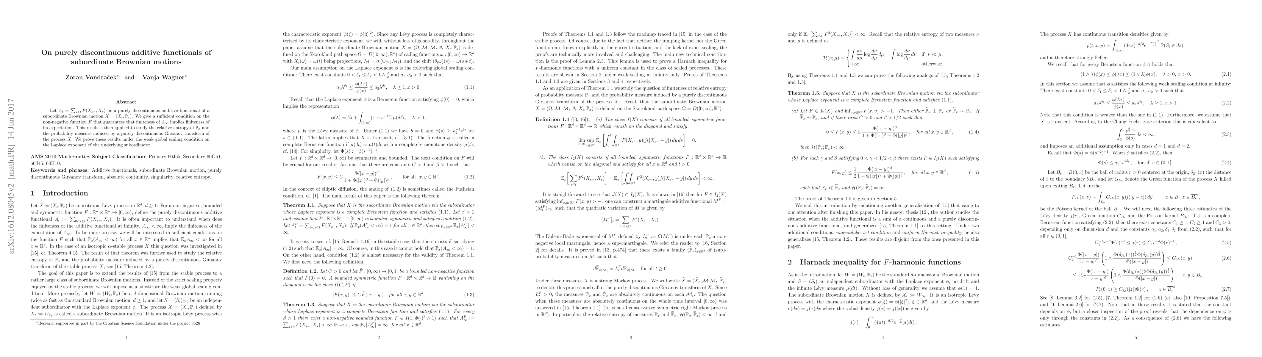 Let $A_t=\sum_{s\le t} F(X_{s-},X_s)$ be a purely discontinuous additive functional of a subordinate Brownian motion $X=(X_t, \mathbb P_x)$. We give a sufficient condition on the non-negative function $F$ that guarantees that finiteness of $A_{\infty}$ implies finiteness of its expectation. This result is then applied to study the relative entropy of $\mathbb P_x$ and the probability measure induced by a purely discontinuous Girsanov transform of the process $X$. We prove these results under the weak global scaling condition on the Laplace exponent of the underlying subordinator.