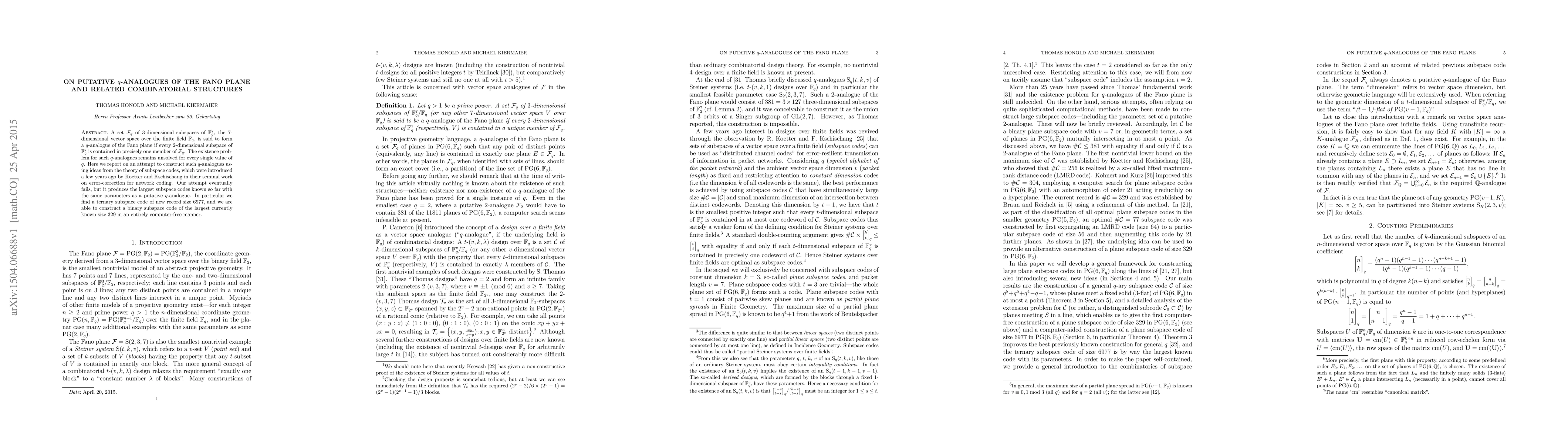 A set $\mathcal{F}_q$ of $3$-dimensional subspaces of $\mathbb{F}_q^7$, the $7$-dimensional vector space over the finite field $\mathbb{F}_q$, is said to form a $q$-analogue of the Fano plane if every $2$-dimensional subspace of $\mathbb{F}_q^7$ is contained in precisely one member of $\mathcal{F}_q$. The existence problem for such $q$-analogues remains unsolved for every single value of $q$. Here we report on an attempt to construct such $q$-analogues using ideas from the theory of subspace codes, which were introduced a few years ago by Koetter and Kschischang in their seminal work on error-correction for network coding. Our attempt eventually fails, but it produces the largest subspace codes known so far with the same parameters as a putative $q$-analogue. In particular we find a ternary subspace code of new record size $6977$, and we are able to construct a binary subspace code of the largest currently known size $329$ in an entirely computer-free manner.