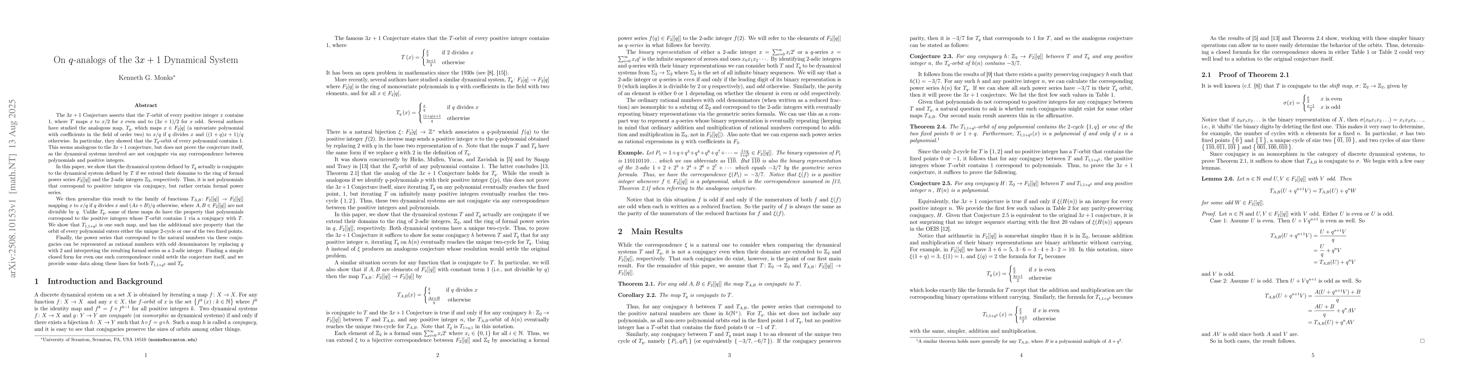 The $3x+1$ Conjecture asserts that the $T$-orbit of every positive integer $x$ contains $1$, where $T$ maps $x$ to $x/2$ for $x$ even and to $(3x+1)/2$ for $x$ odd. Several authors have studied the analogous map, $T_q$, which maps $x\in F_2[q]$ to $x/q$ if $q$ divides $x$ and $((1+q)x+1)/q$ otherwise. In particular, they showed that the $T_q$-orbit of every polynomial contains $1$. This seems analogous to the $3x+1$ conjecture, but does not prove the conjecture itself, as the dynamical systems involved are not conjugate via any correspondence between polynomials and positive integers. In this paper, we show that $T_q$ actually is conjugate to $T$ if we extend their domains to the ring of formal power series $F_2[[q]]$ and the 2-adic integers $\mathbb{Z}_2$, respectively. Thus, it is not polynomials that correspond to positive integers via conjugacy, but rather certain formal power series. We then generalize this result to the family of functions $T_{A,B}\colon F_2[[q]]\to F_2[[q]]$ mapping $x$ to $x/q$ if $q$ divides $x$ and $(Ax+B)/q$ otherwise, where $A,B\in F_2[[q]]$ are not divisible by $q$. Unlike $T_q$, some of these maps do have the property that polynomials correspond to the positive integers whose $T$-orbit contains $1$ via a conjugacy with $T$. We show that $T_{1,1+q^2}$ is one such map, and has the additional nice property that the orbit of every polynomial enters either the unique $2$-cycle or one of the two fixed points. Finally, the power series that correspond to the natural numbers via these conjugacies can be represented as rational numbers with odd denominators by replacing $q$ with $2$ and interpreting the resulting formal series as a 2-adic integer. Finding a simple closed form for even one such correspondence could settle the conjecture itself, and we provide some data along these lines for both $T_{1,1+q^2}$ and $T_q$.